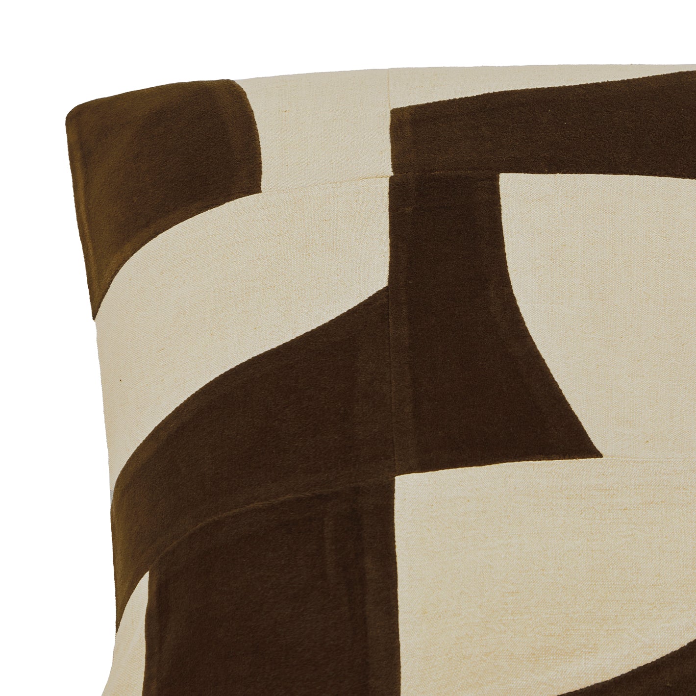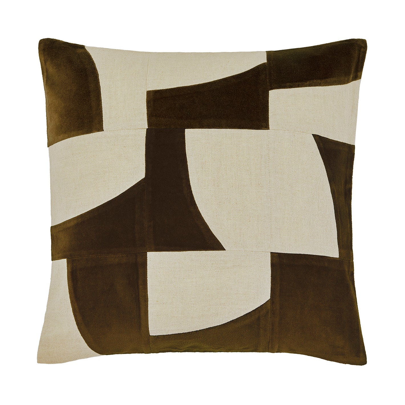 ベロア生地と平織り生地をパッチワークで縫い合わせた、抽象柄のクッションカバー。