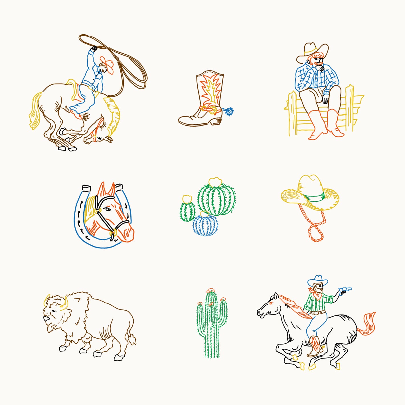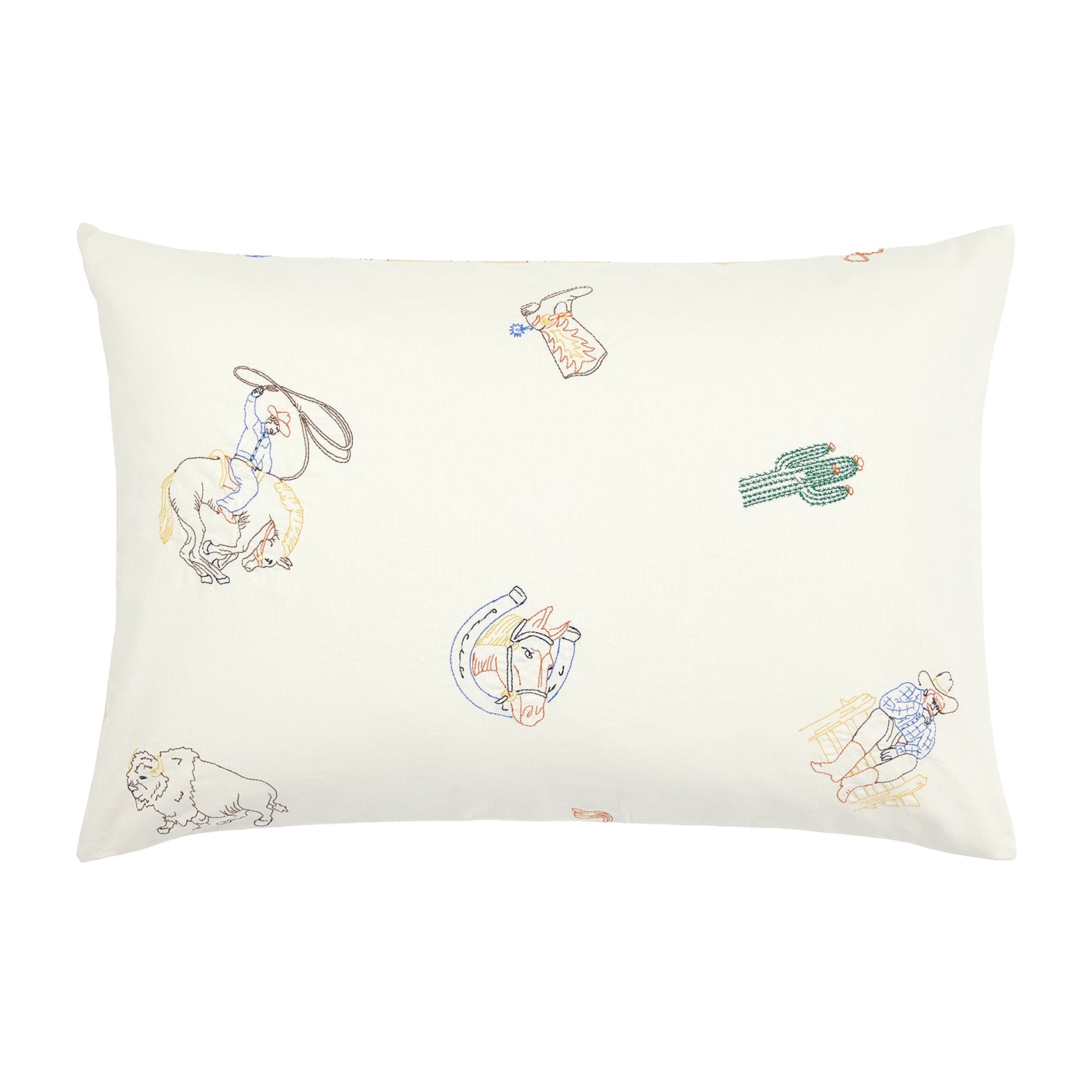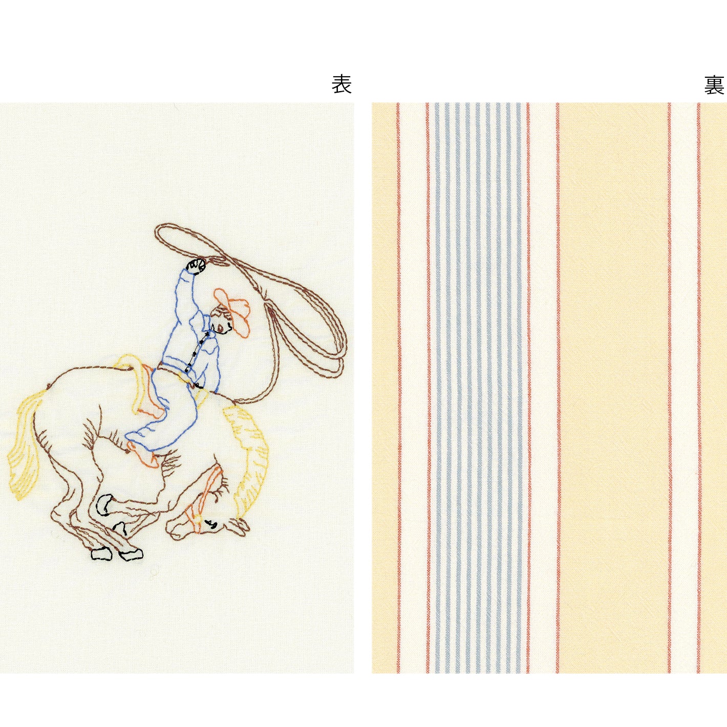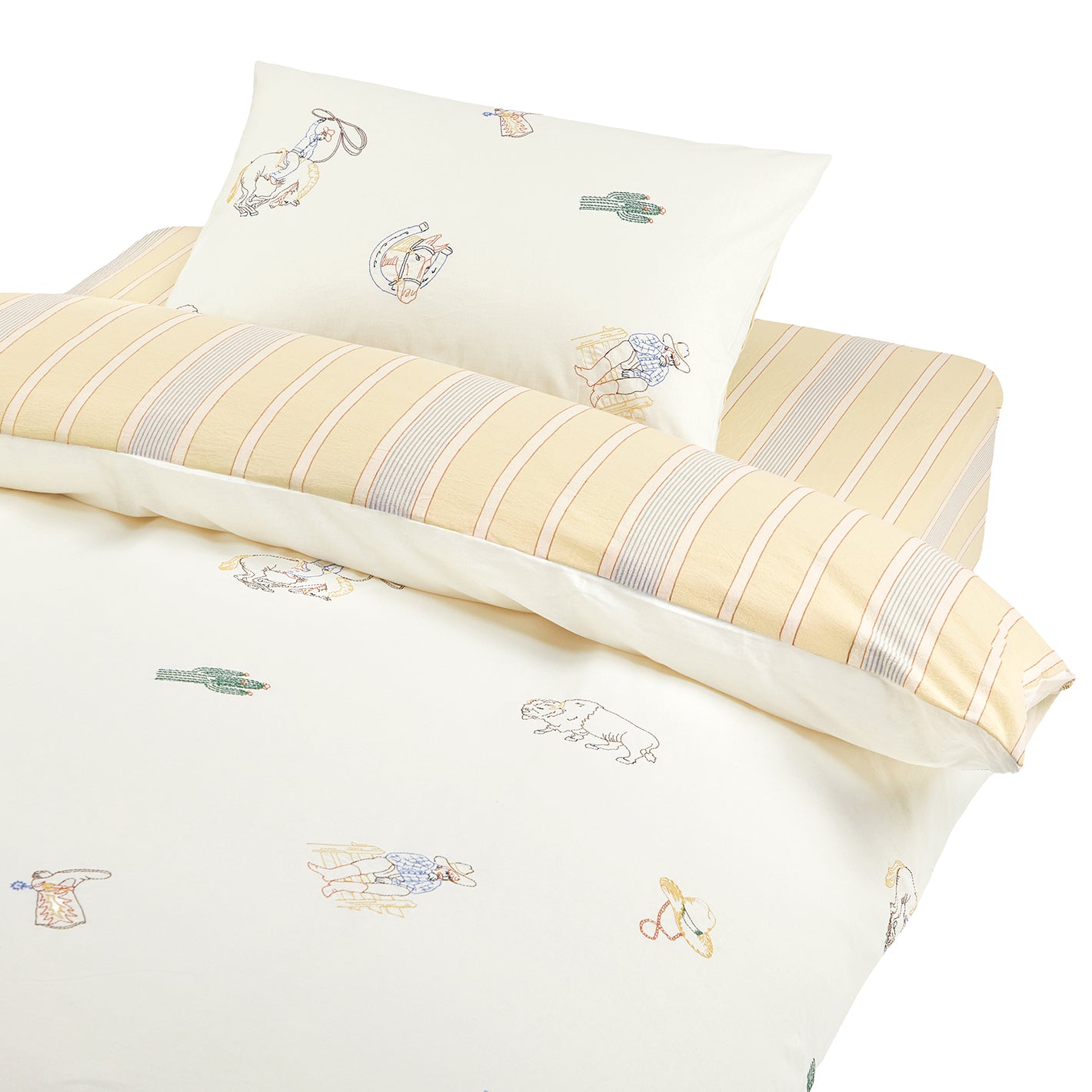 カウボーイにまつわる柄の刺繍をちりばめた、ヴィンテージテイストのベッドリネン。
