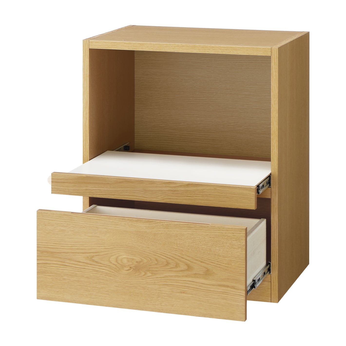 家電などをすっきりと収納できる、機能的なスライド棚も備えています。