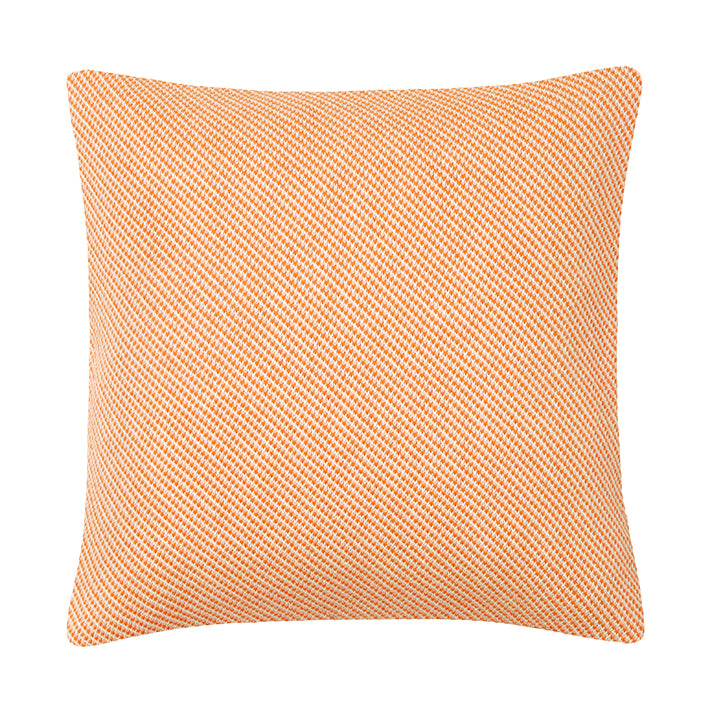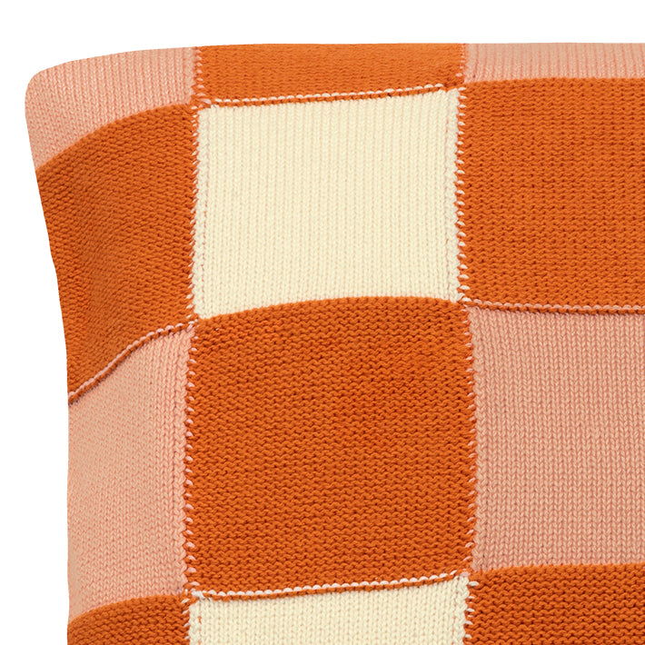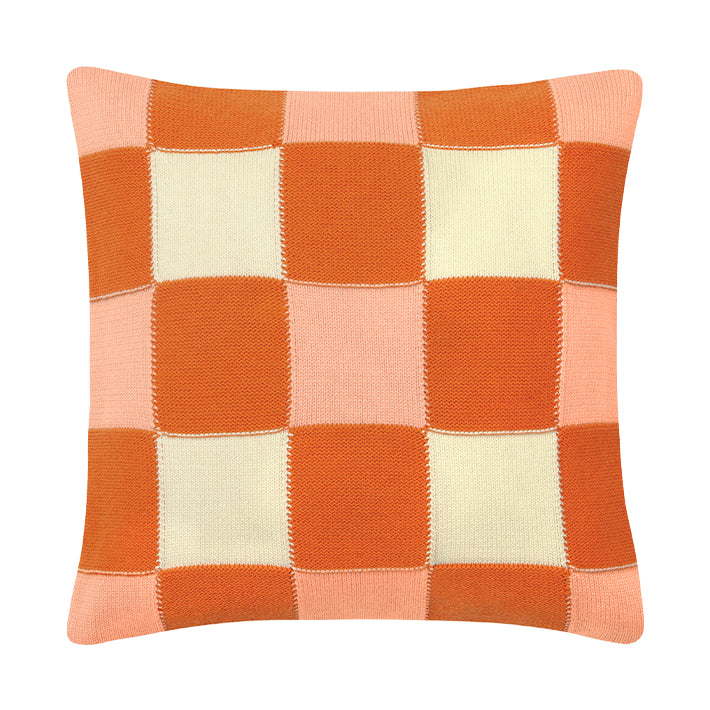 糸を切り替えながら編み込むインターシャ編みのチェック柄が、お部屋のポイントになるニットクッションカバー。