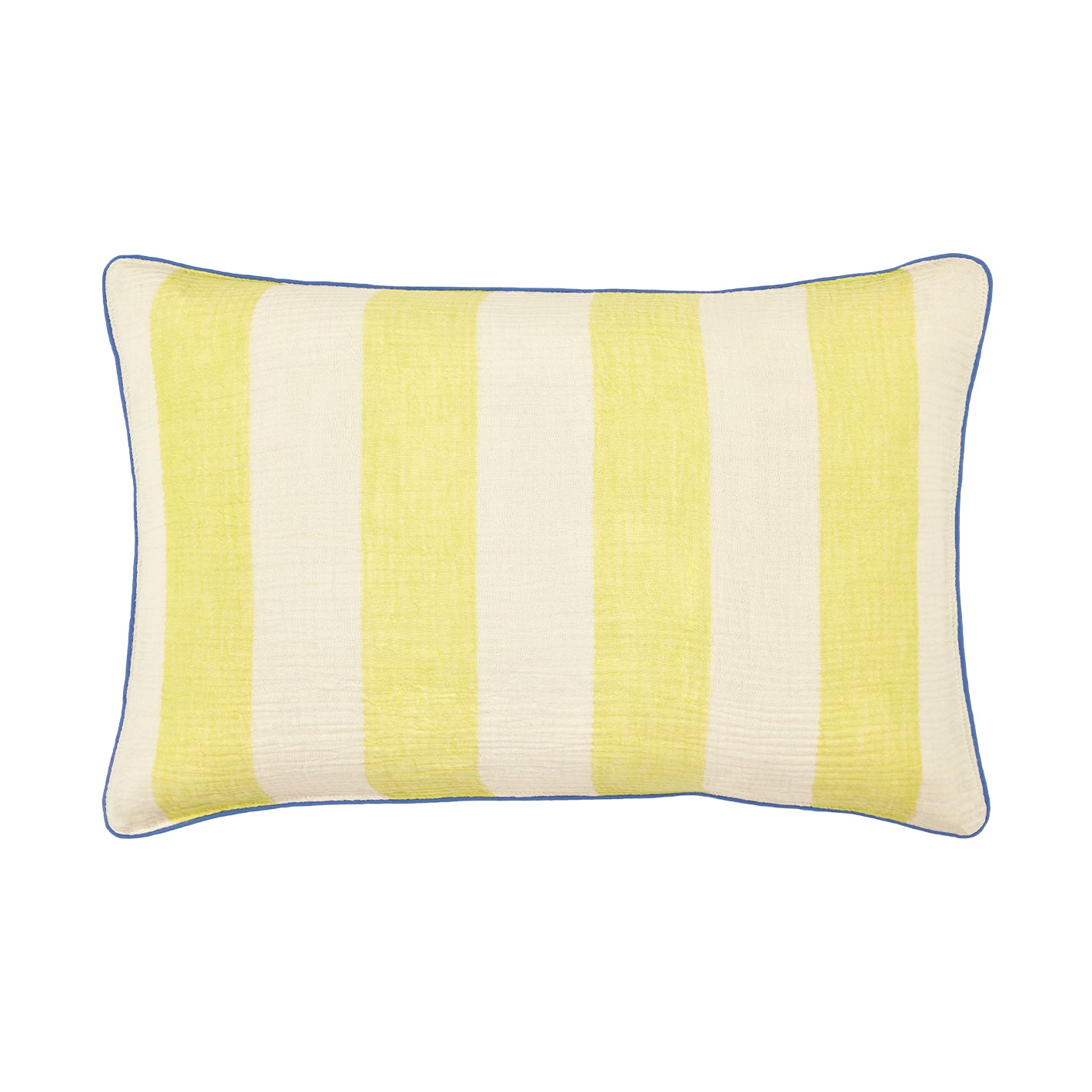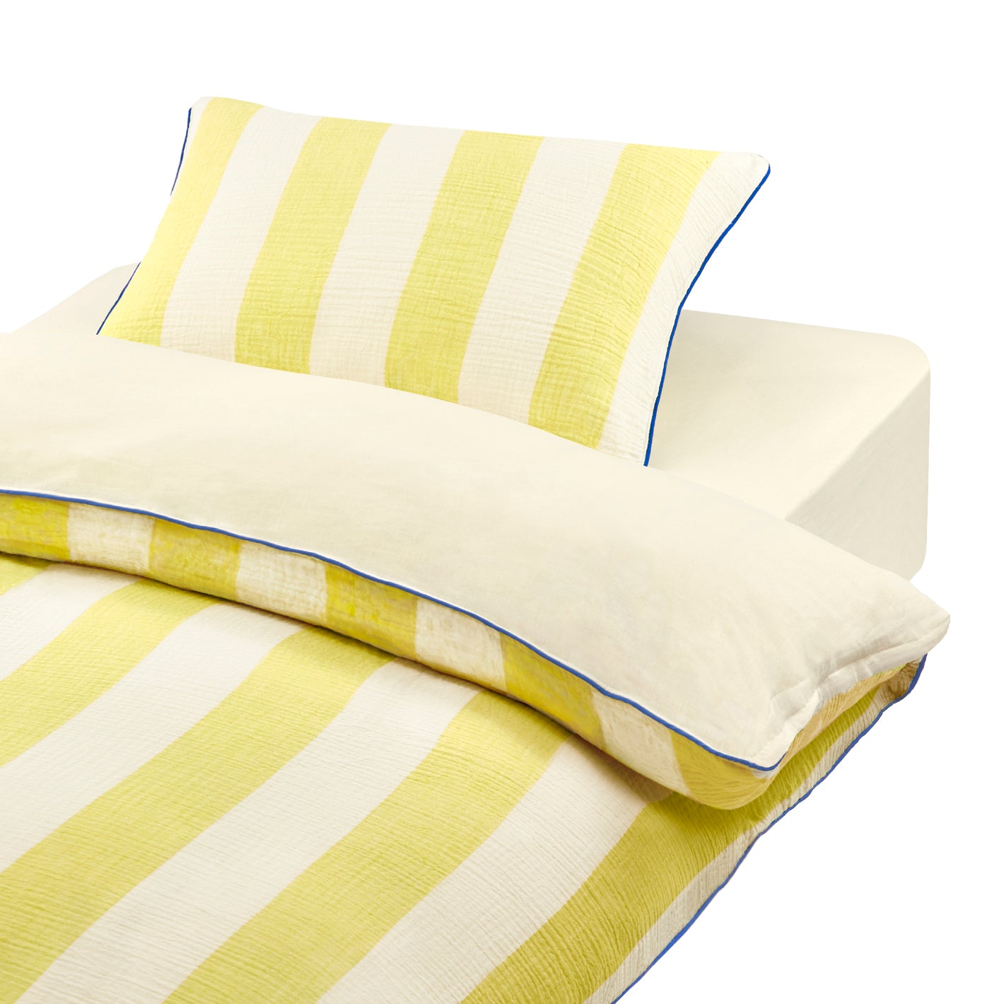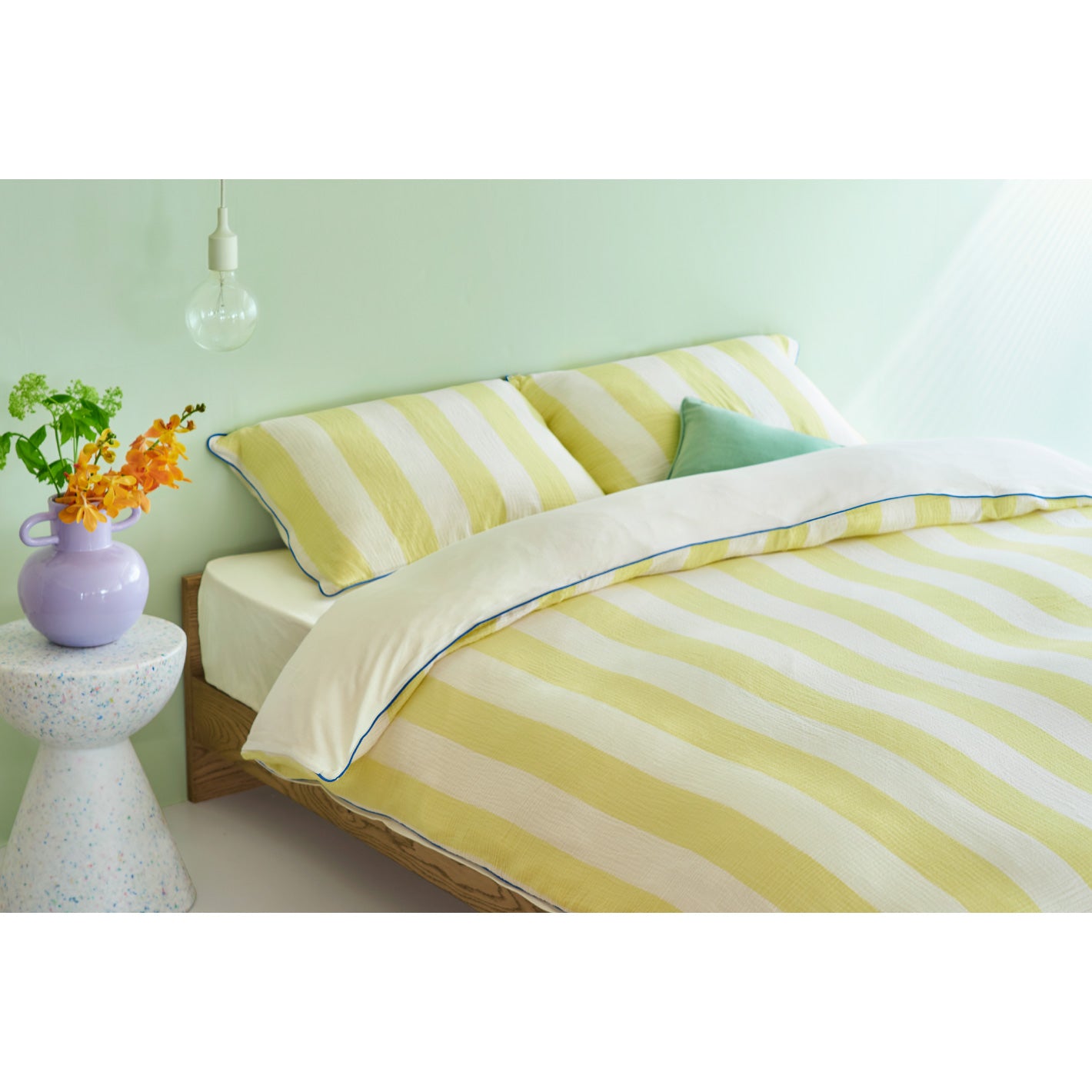 太めのストライプ柄や、パイピングのカラーがポイントになったベッドリネン。