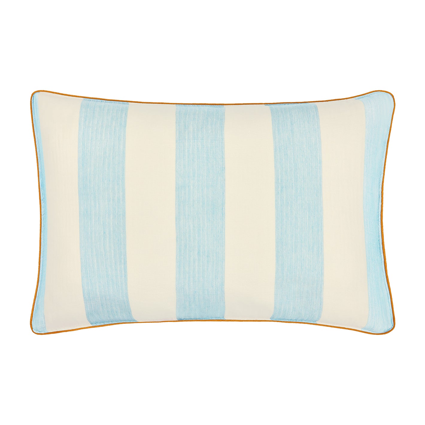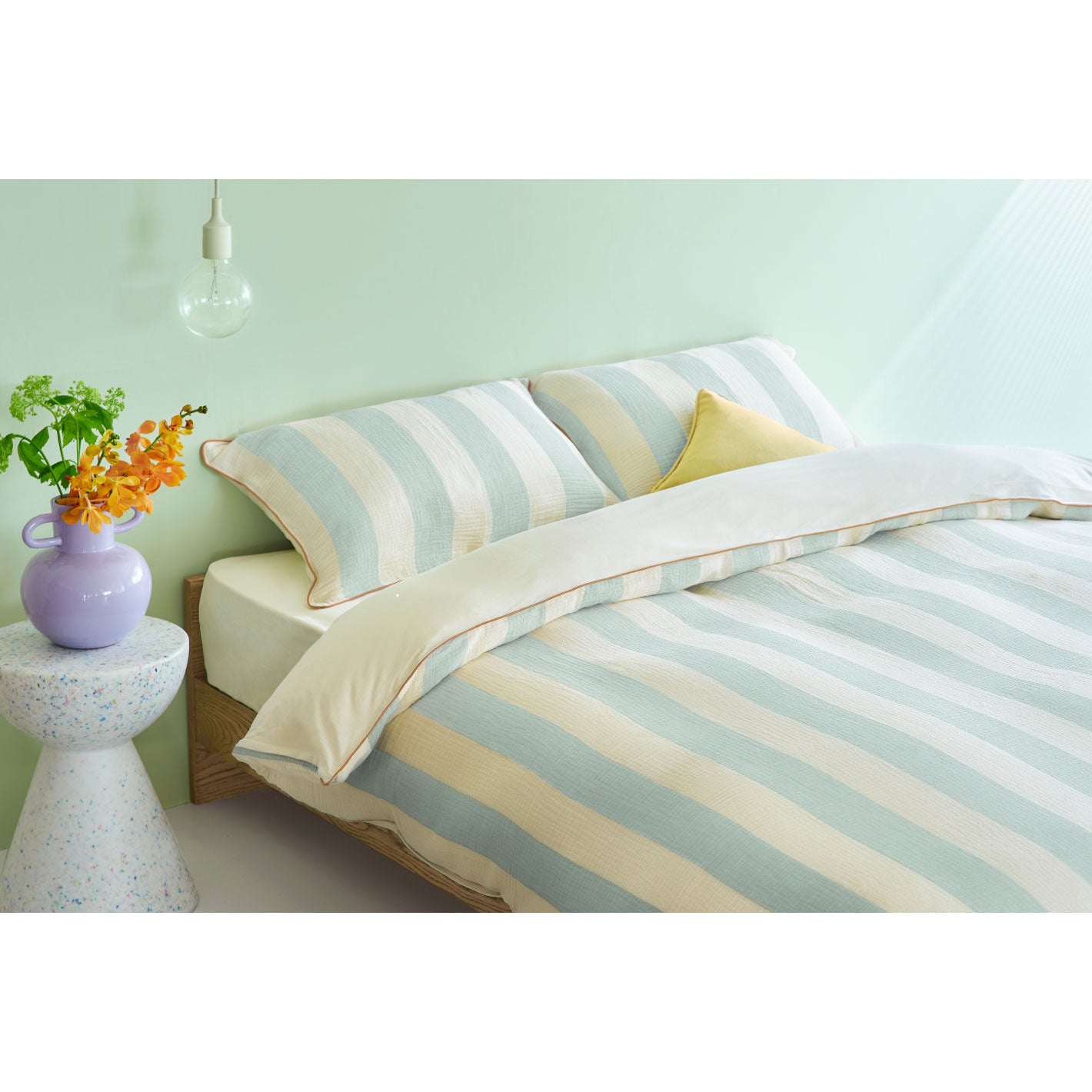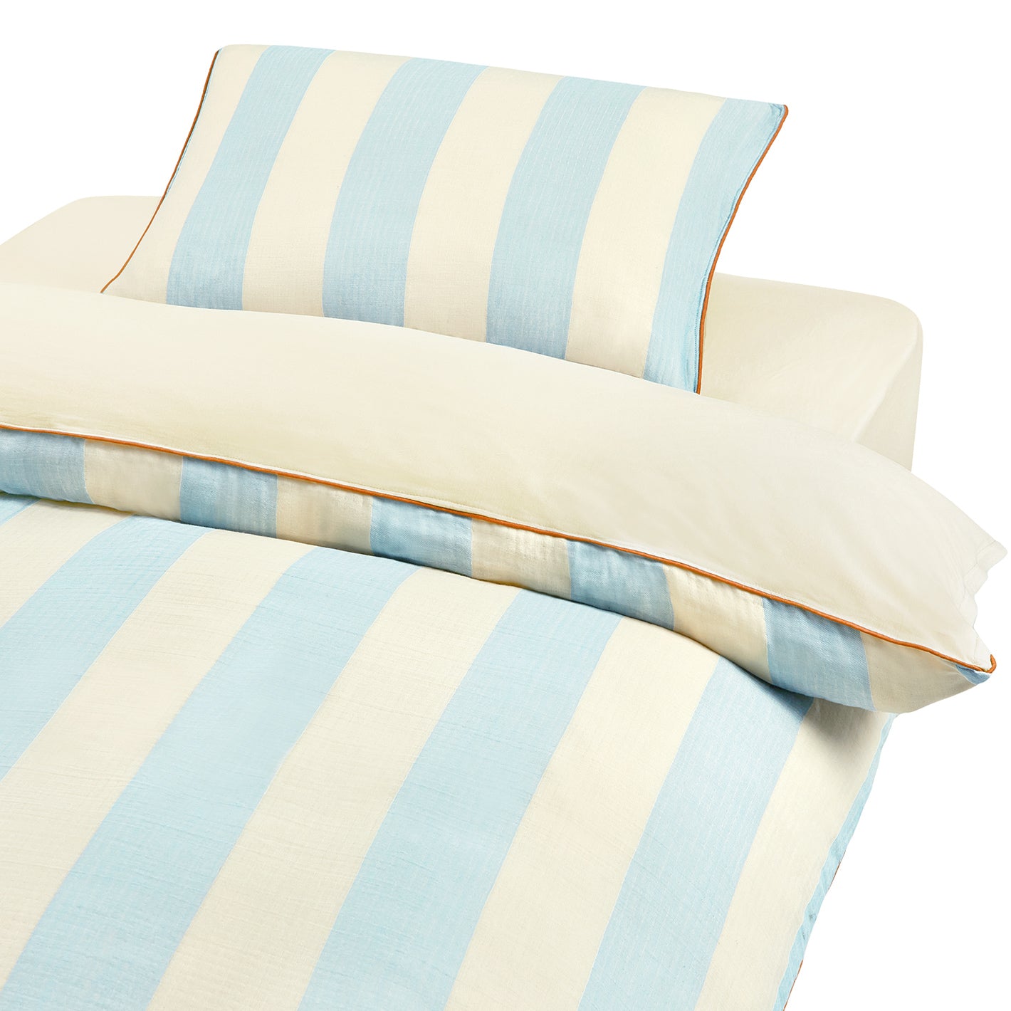 太めのストライプ柄や、パイピングのカラーがポイントになったベッドリネン。