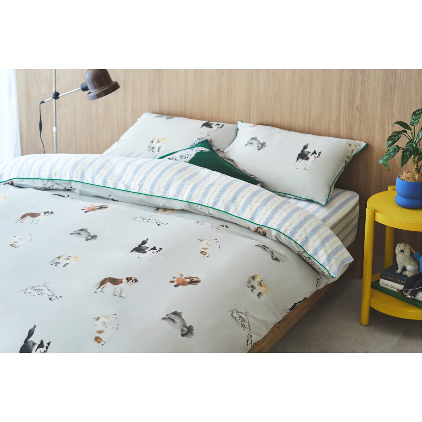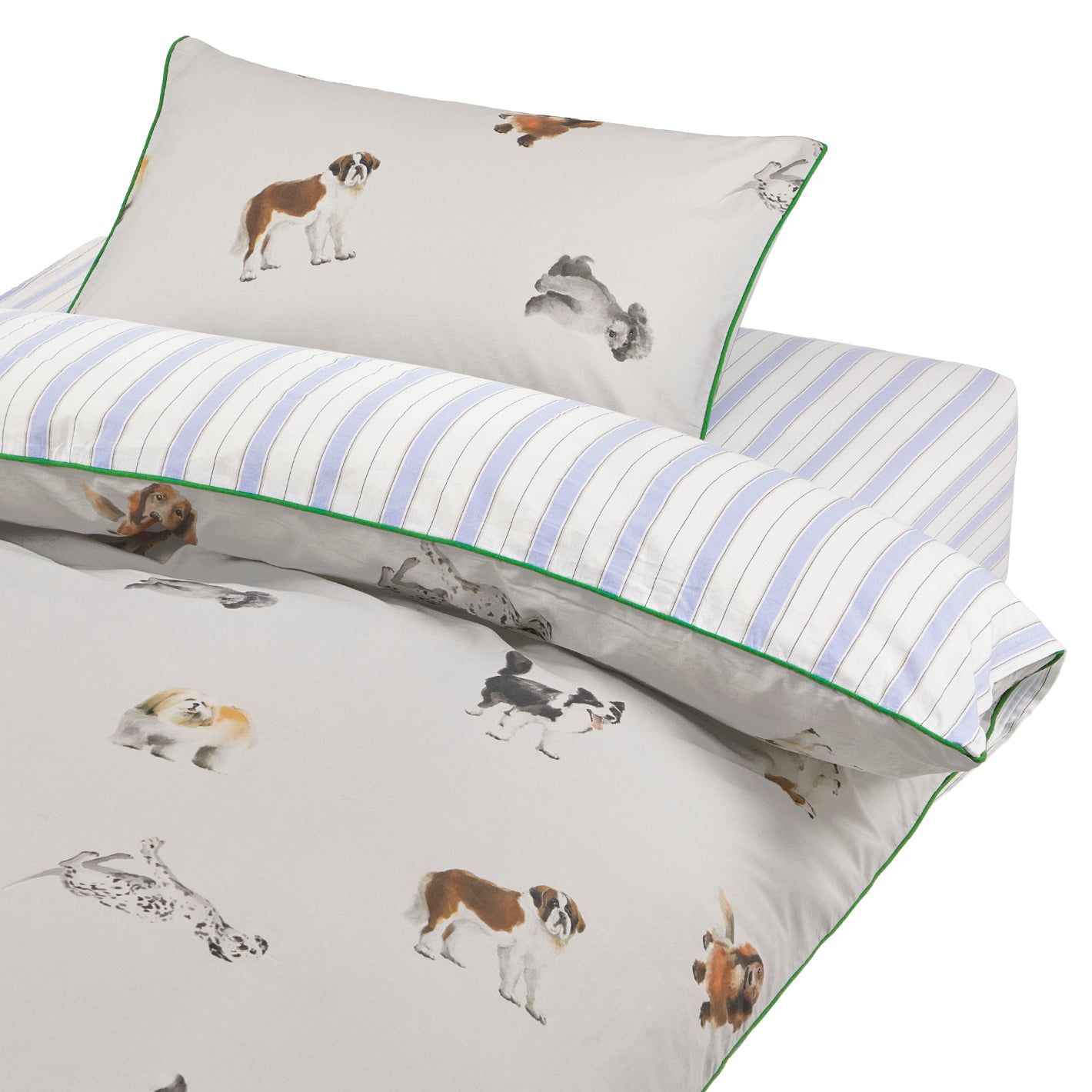 さまざまな犬種の犬たちが集まった、ユニークなデザインの掛布団カバー。