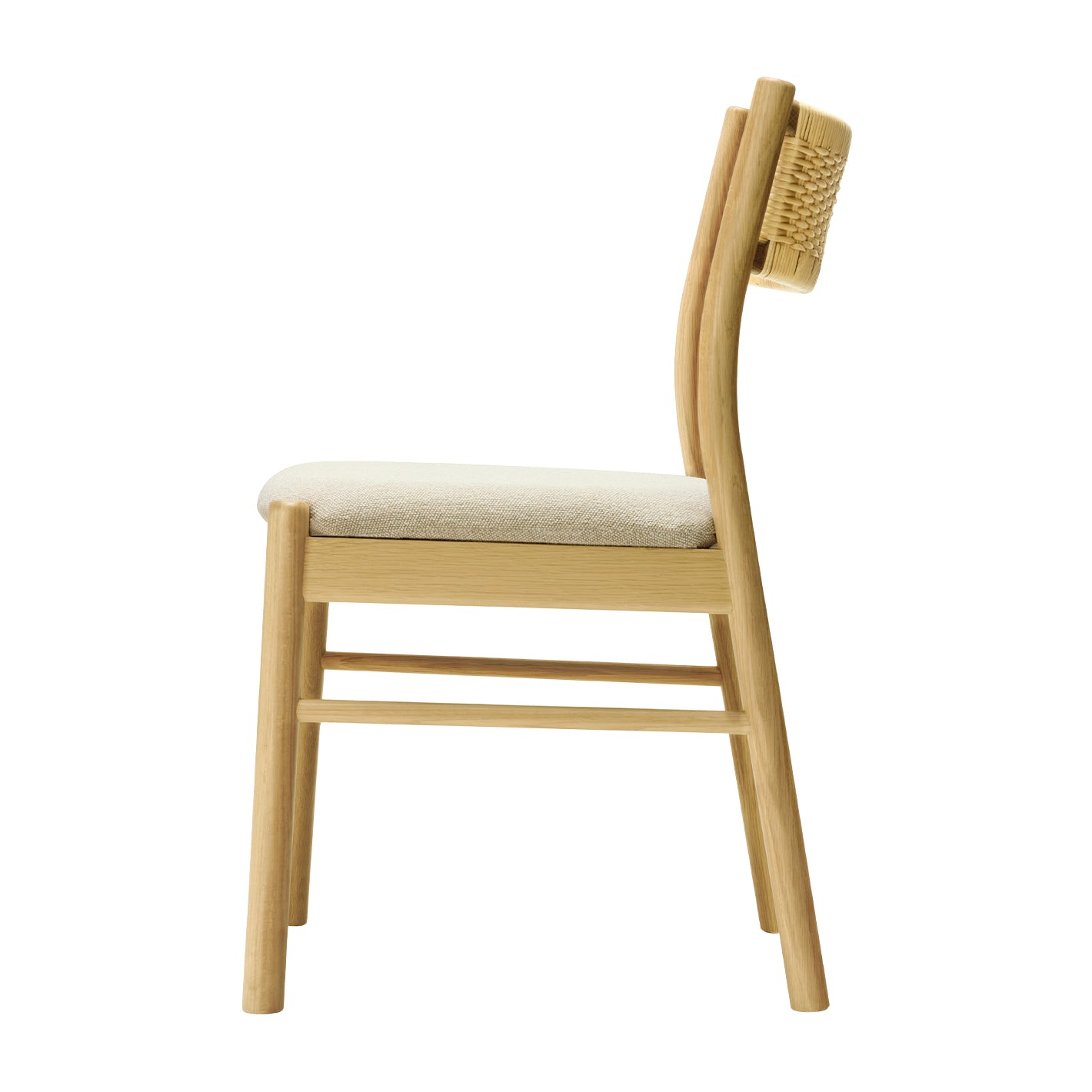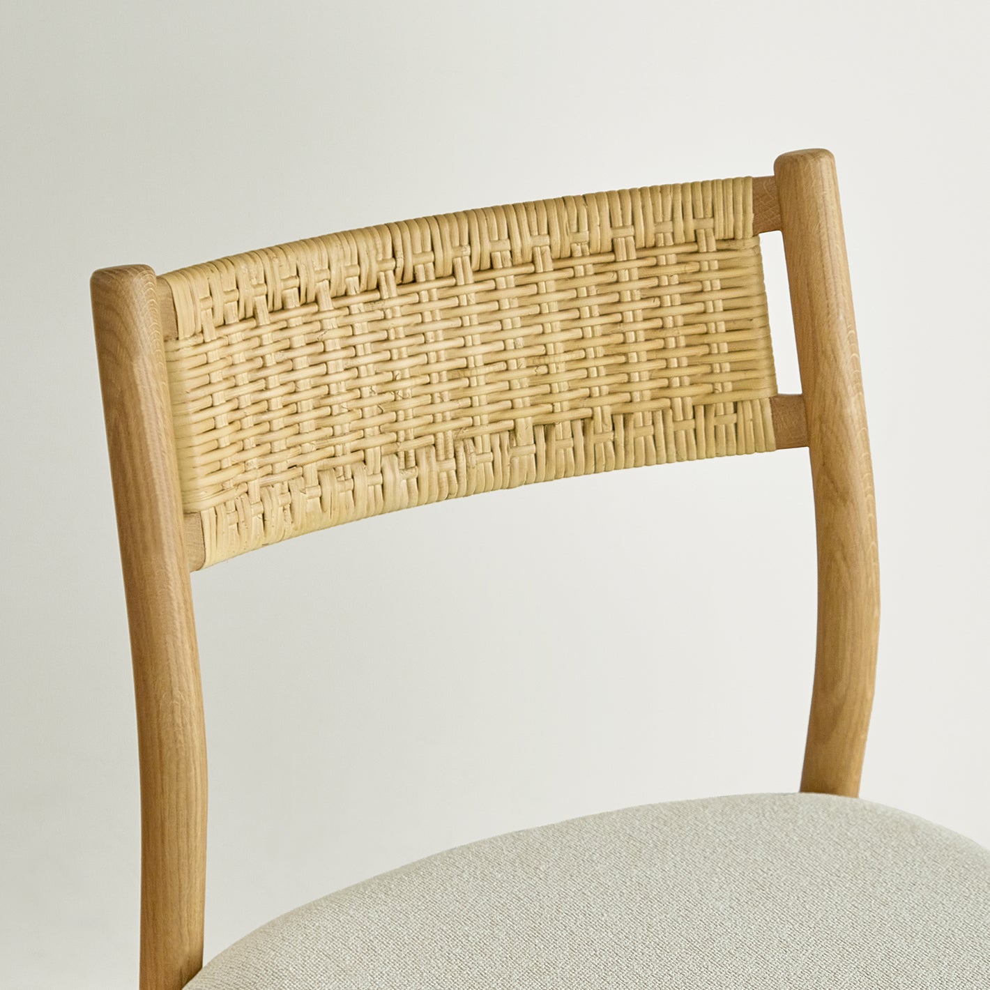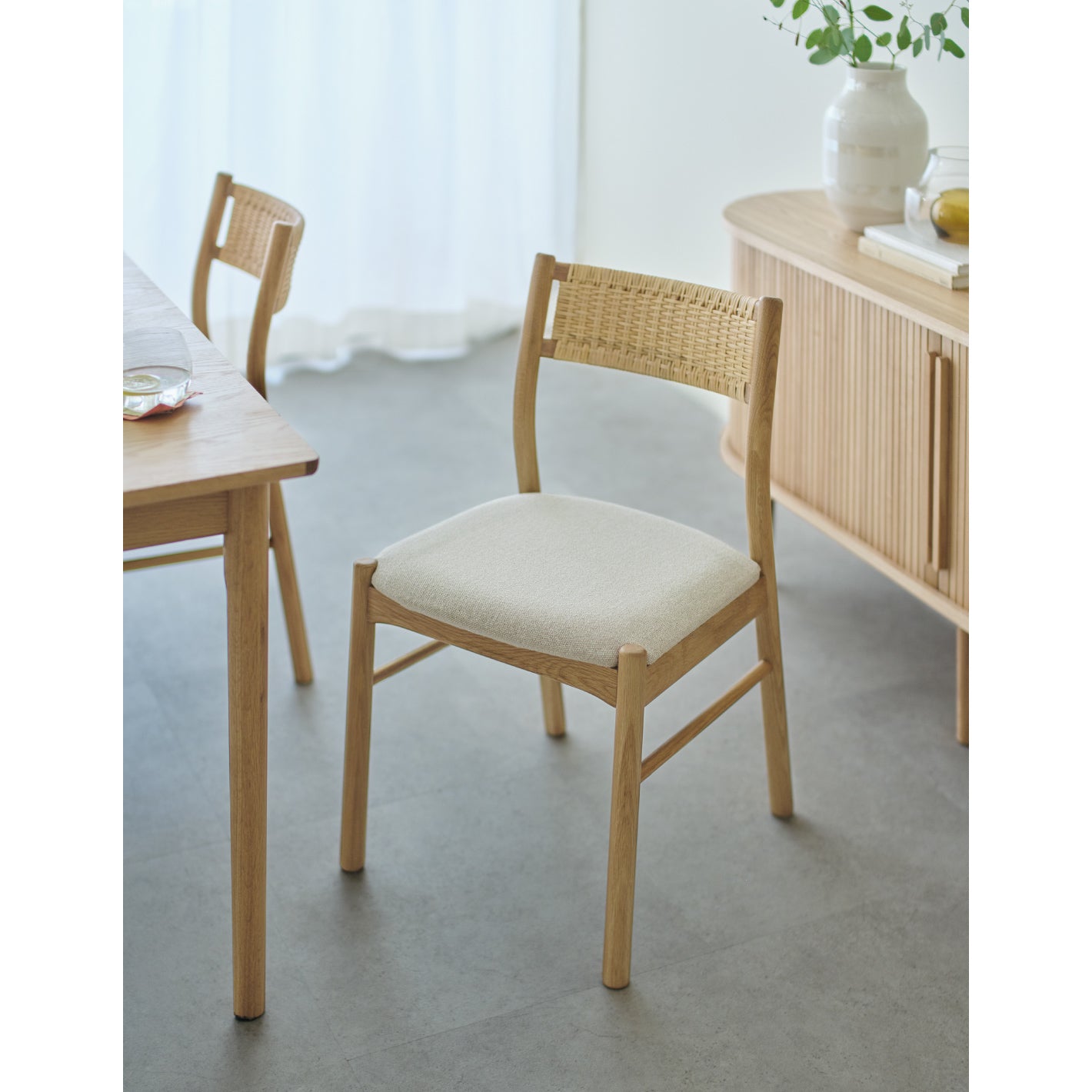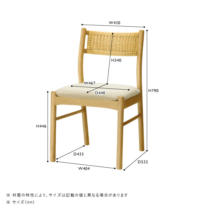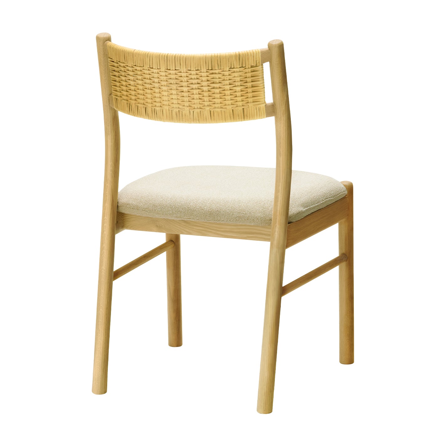 背もたれのラタンがアクセントになった、シンプルなデザインのチェア。