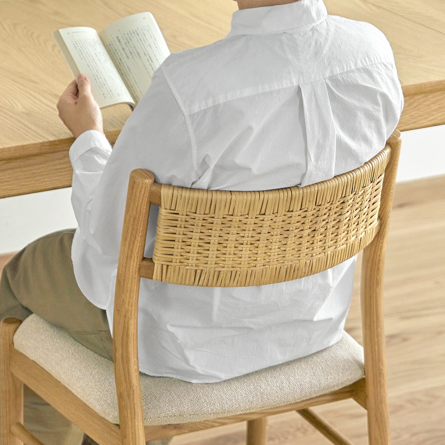 職人が時間をかけてていねいに編み上げた、背もたれのラタンがポイント。