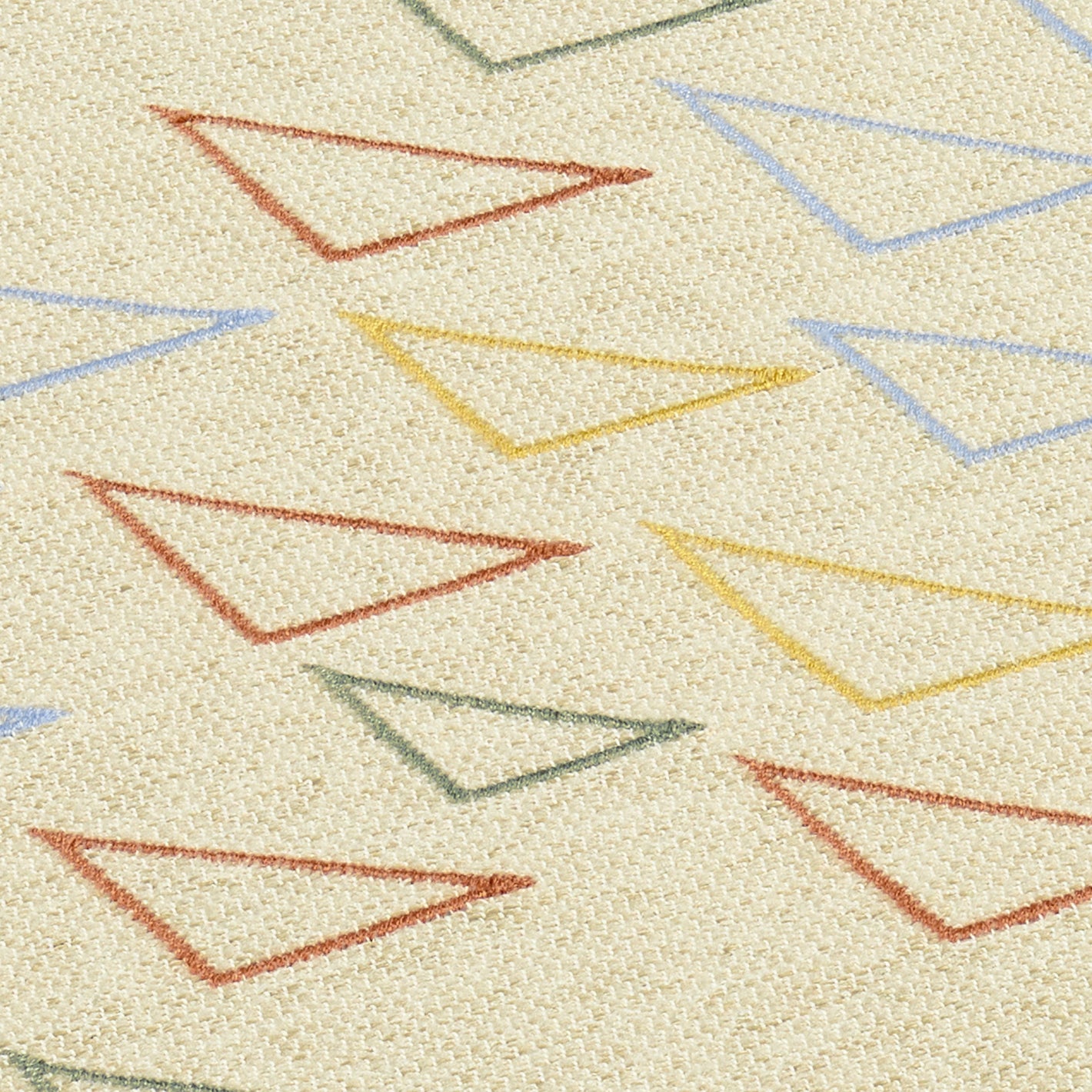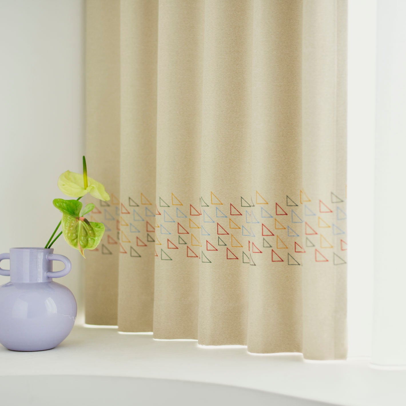 裾のカラフルな三角形の刺繍がアクセントになった遮光カーテン。