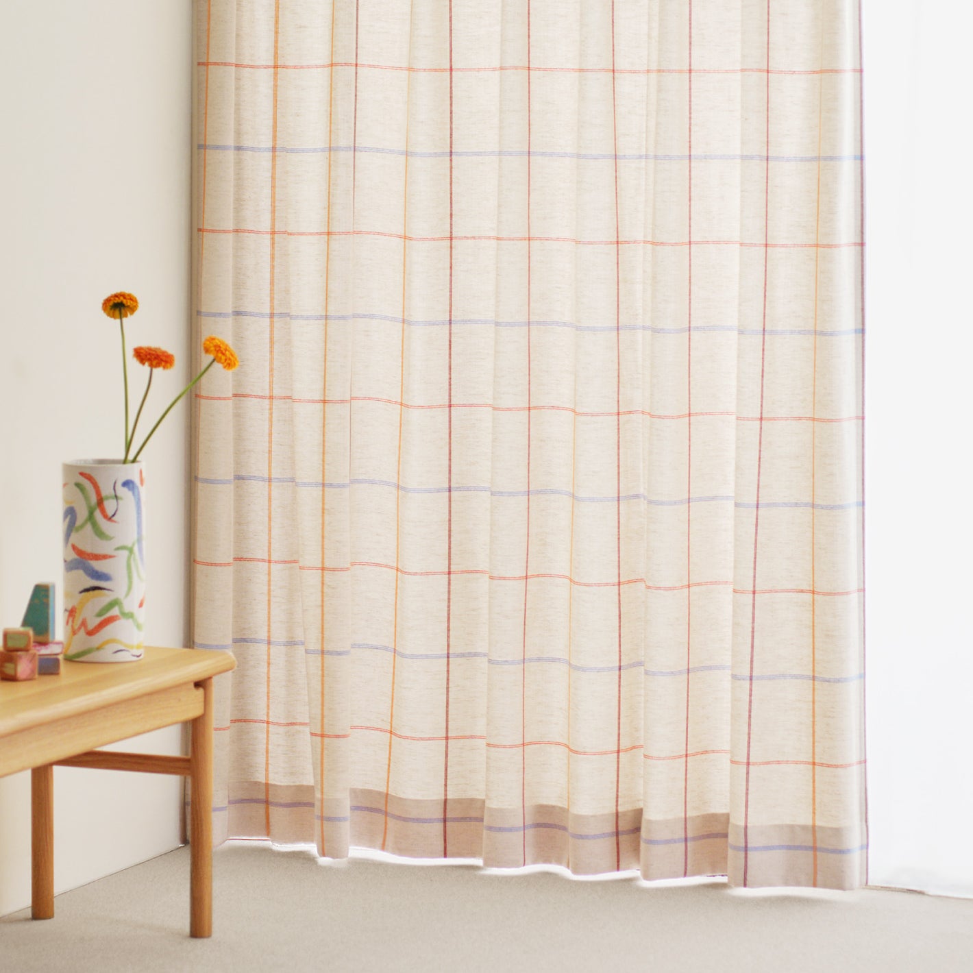 お部屋を明るい雰囲気にする、カラフルなチェック柄のカーテン。