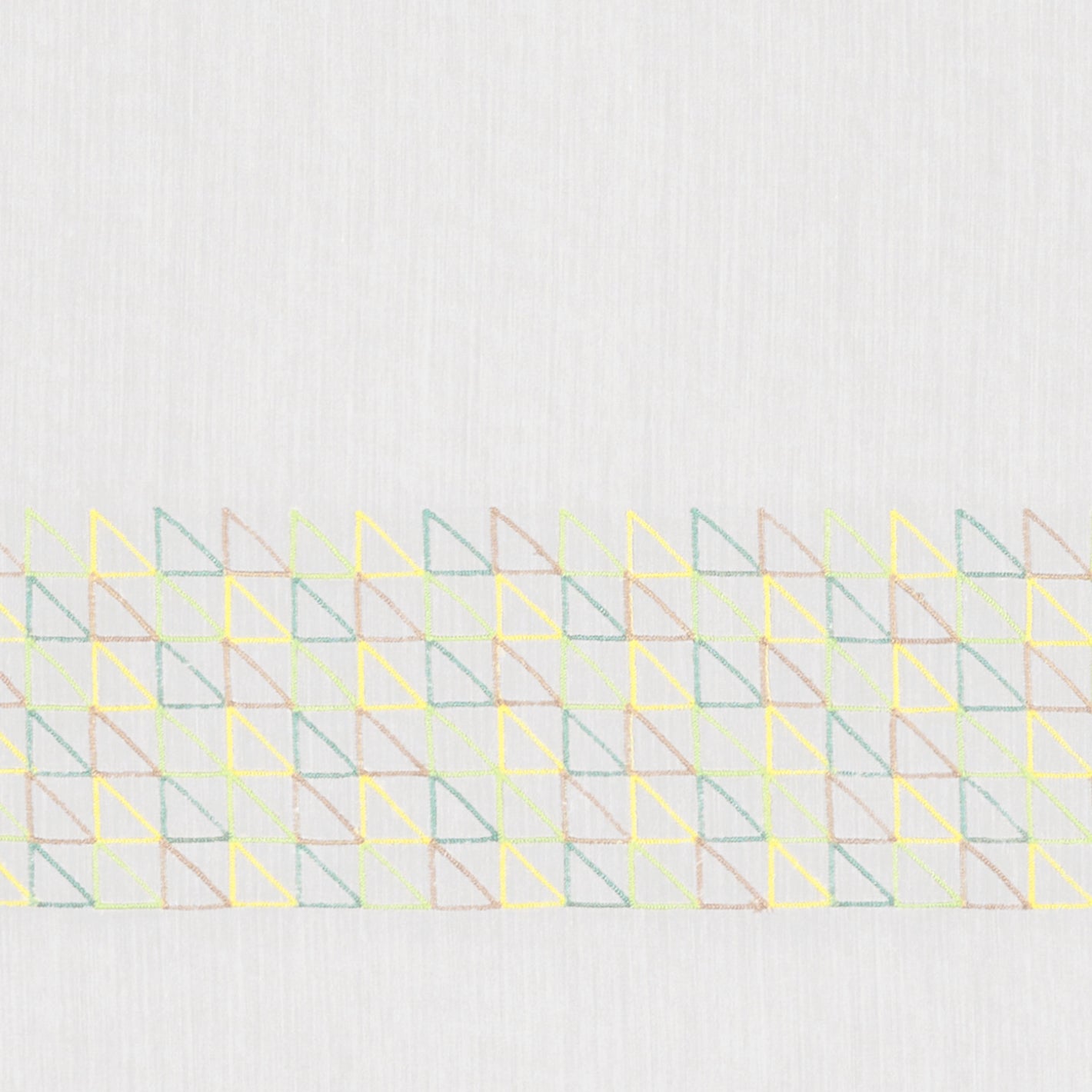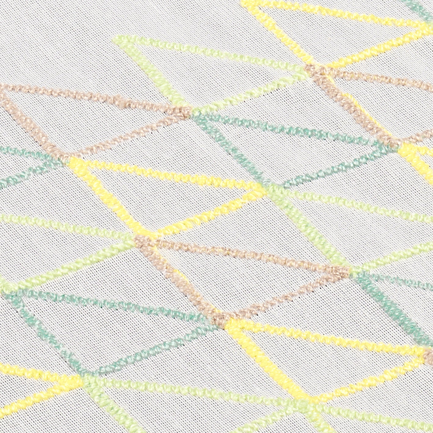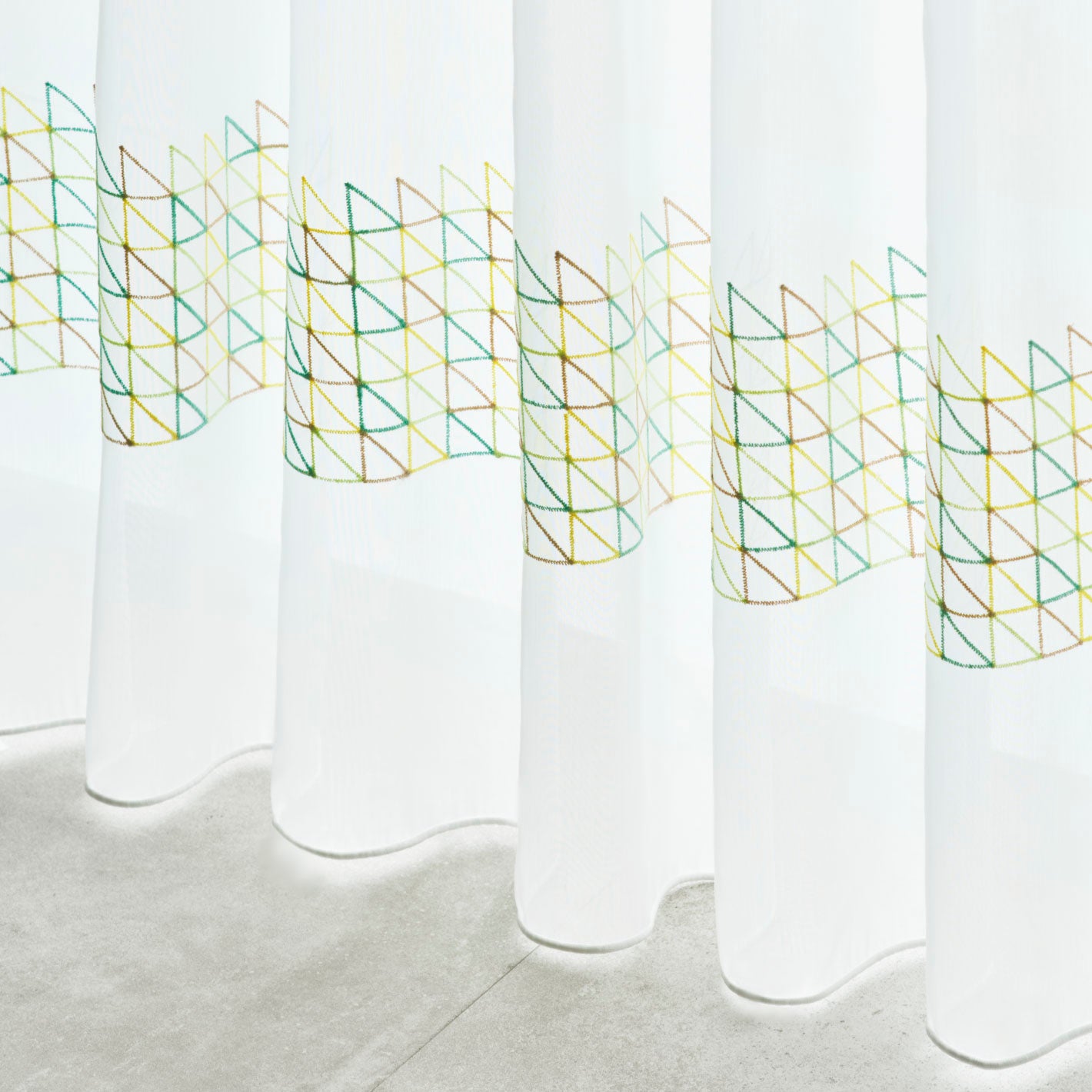 裾のカラフルな三角形の刺繍がアクセントになった、パネルデザインのレースカーテン。