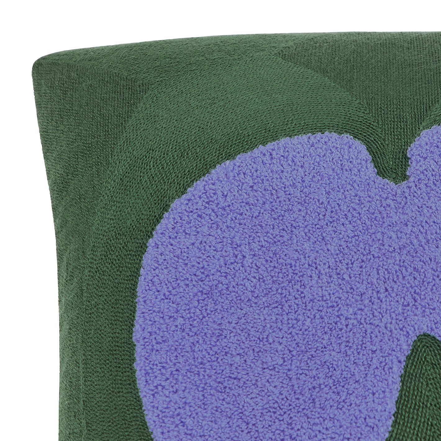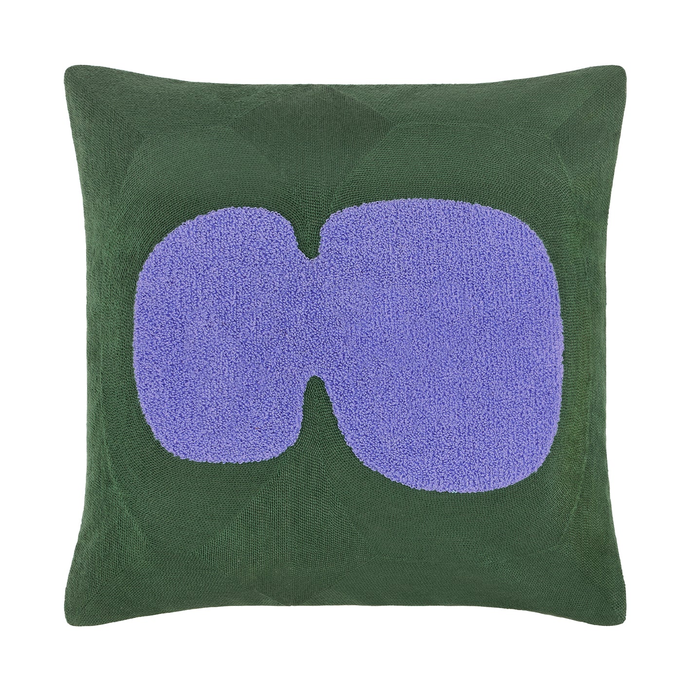 丸みのある抽象モチーフを中央に配置したデザインのクッションカバー。