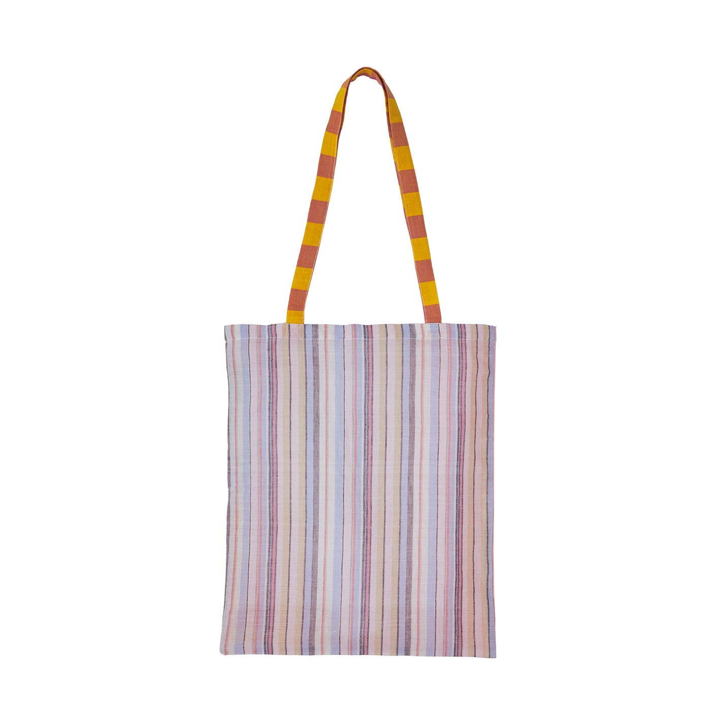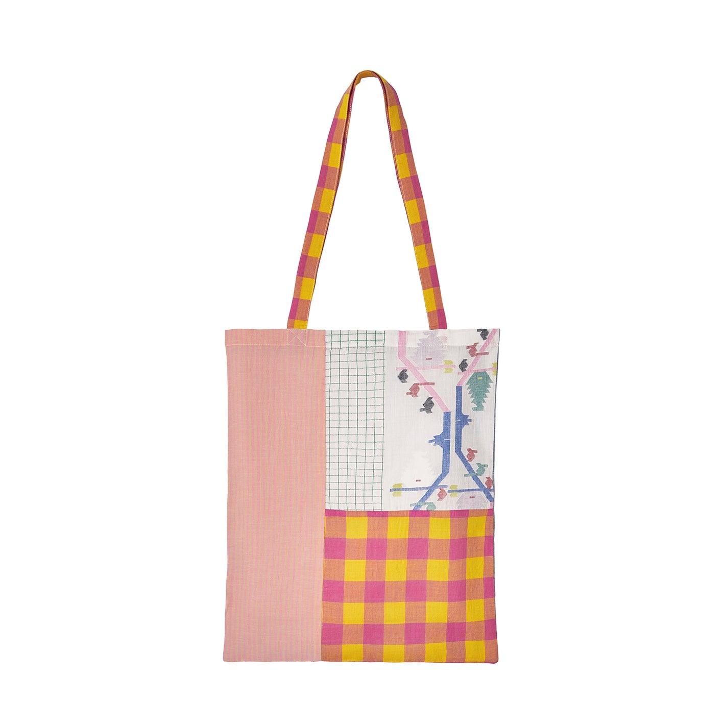 インドの職人が手織りで仕上げた、さまざまな柄の生地を組み合わせたトートバッグ。