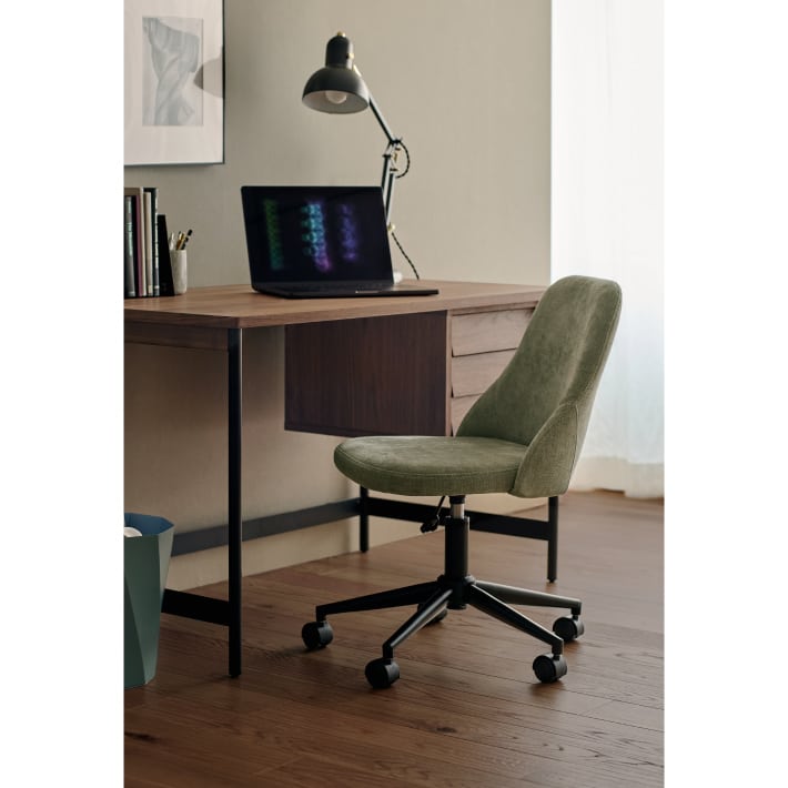 デスクやテーブルから出入りがしやすい、丸みのあるデザインの回転式チェア。