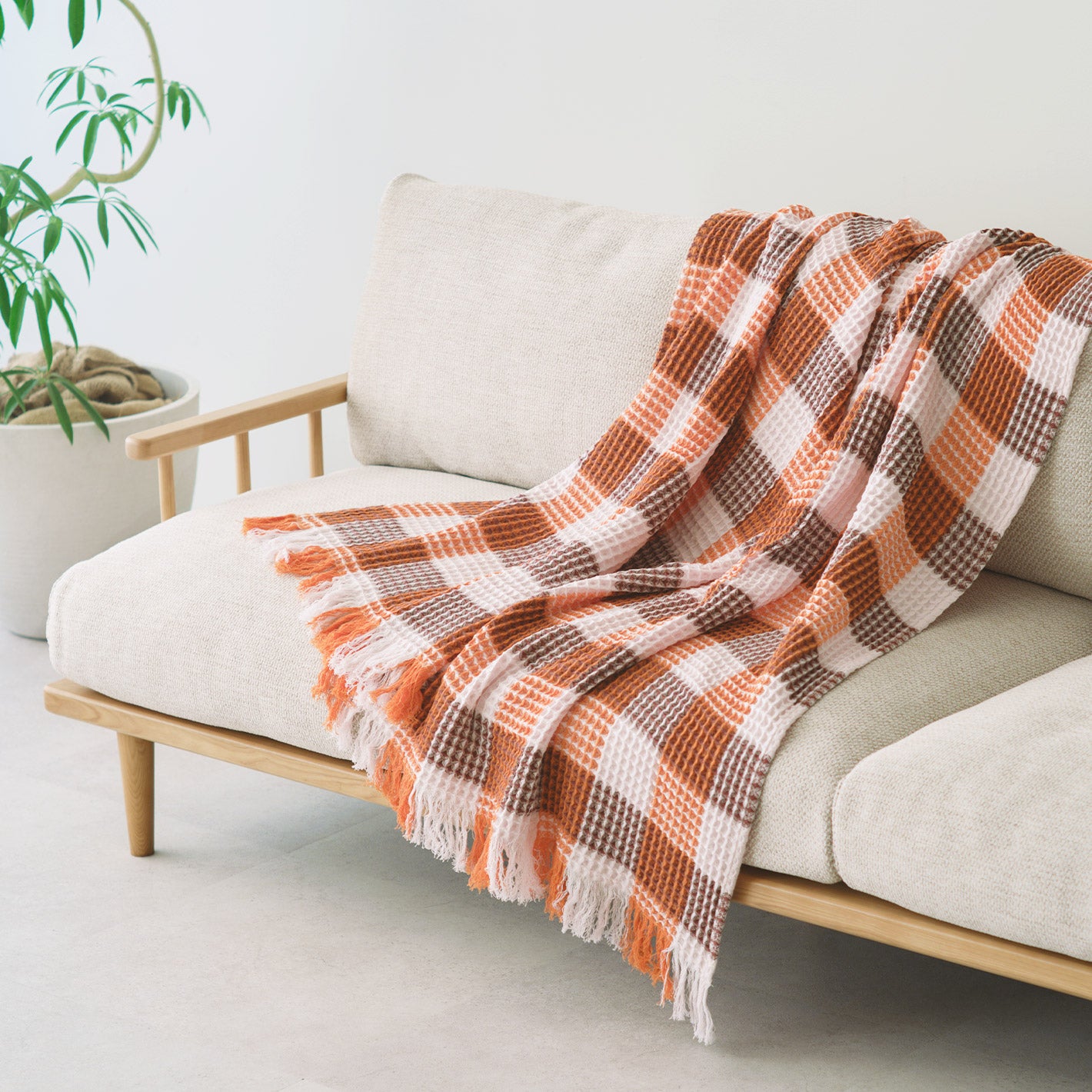明るいカラーのチェック柄がかわいらしい、ワッフル生地のブランケット。
