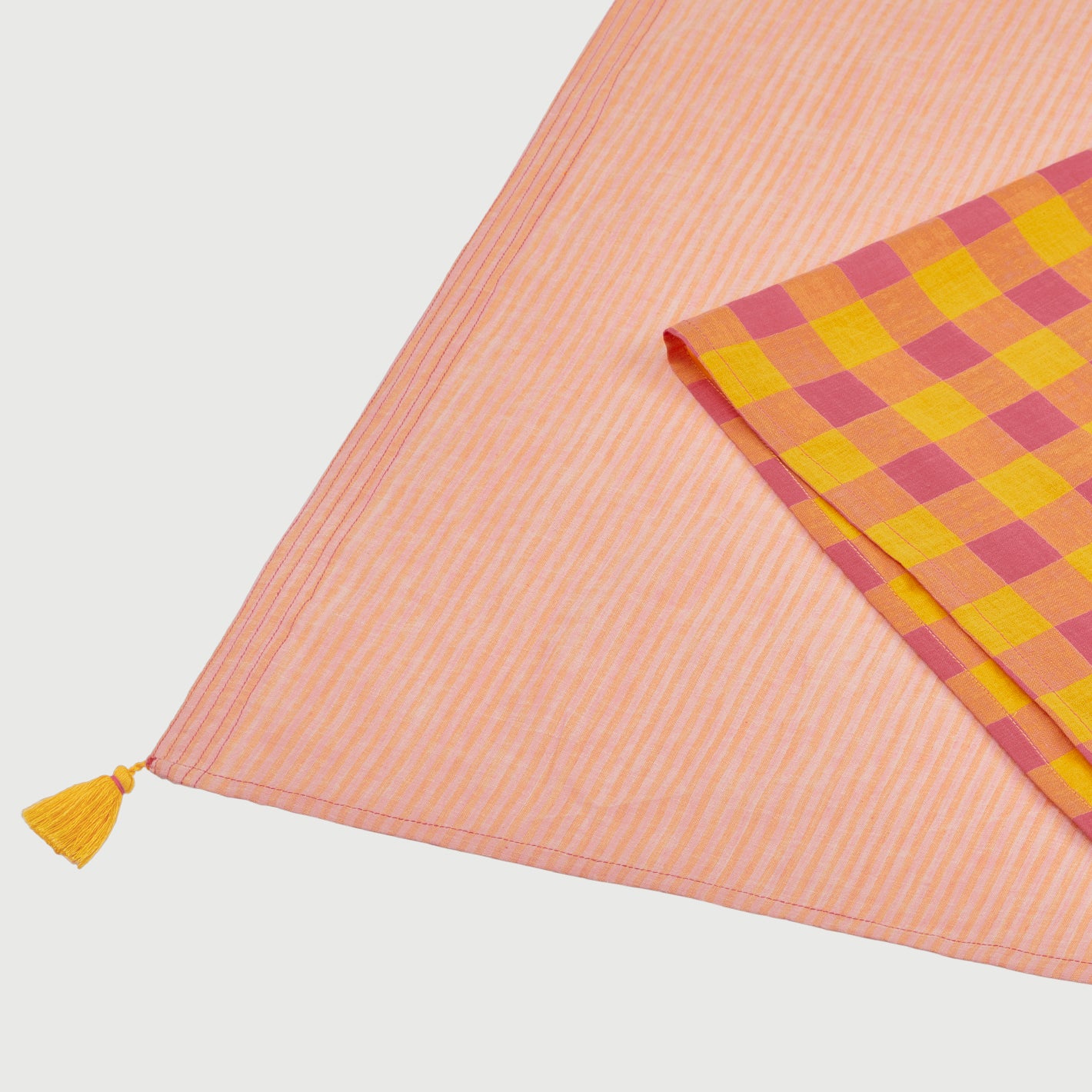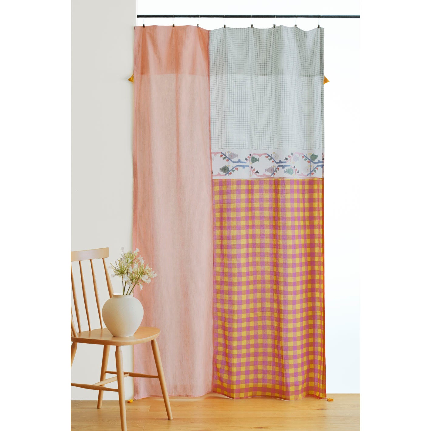 インドの職人が手織りで仕上げた、さまざまな柄の生地を組み合わせたマルチクロス。