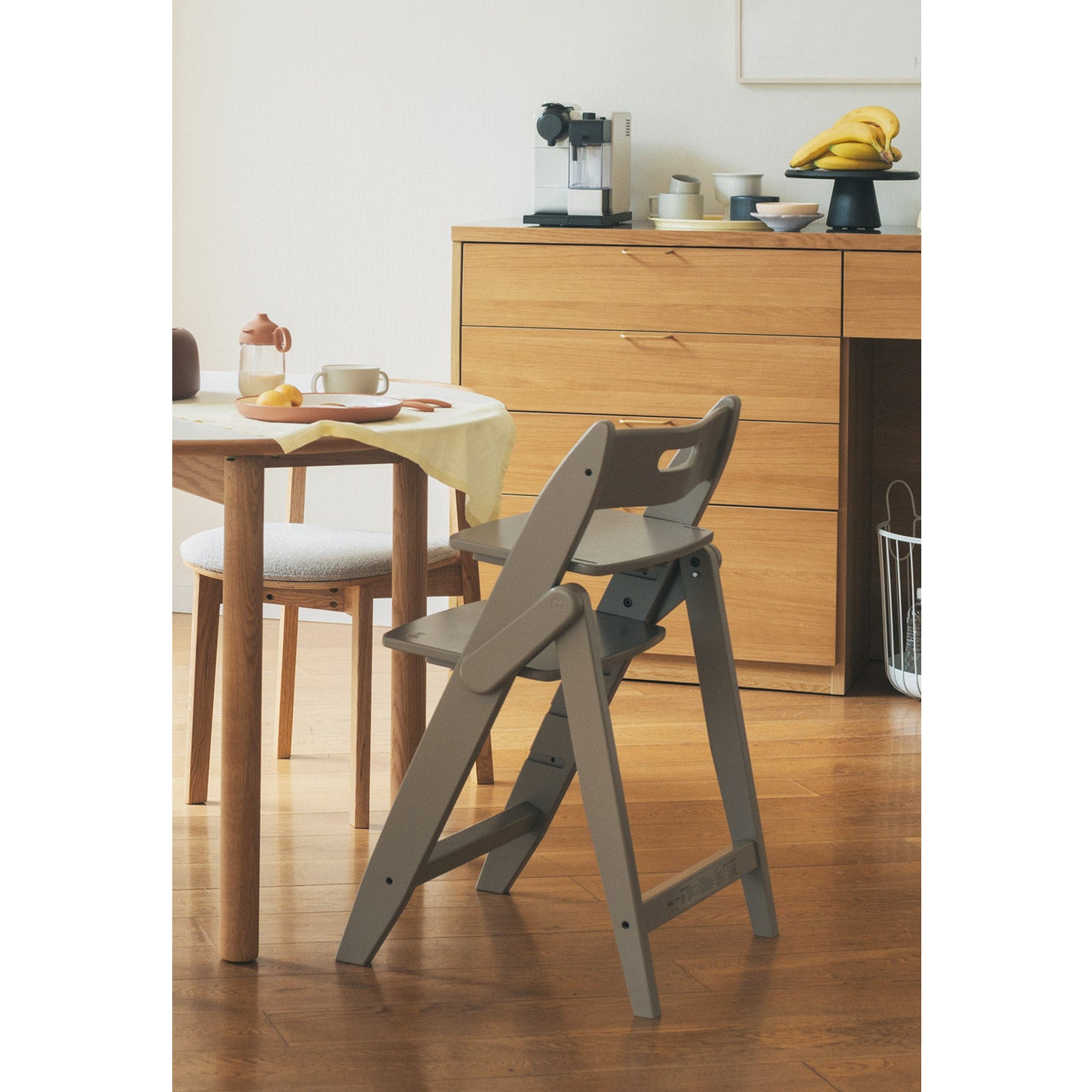 お子さまから大人まで、幅広く使える折りたたみ式のハイチェア。