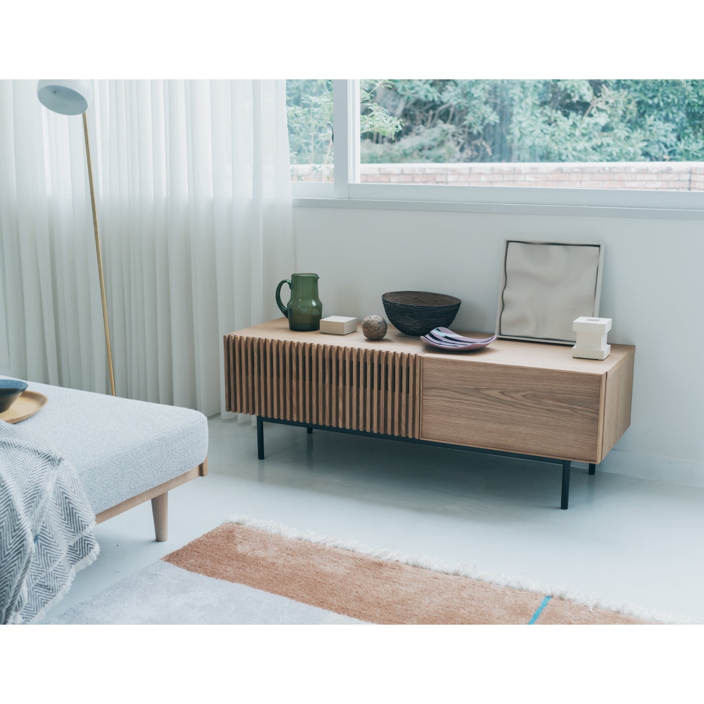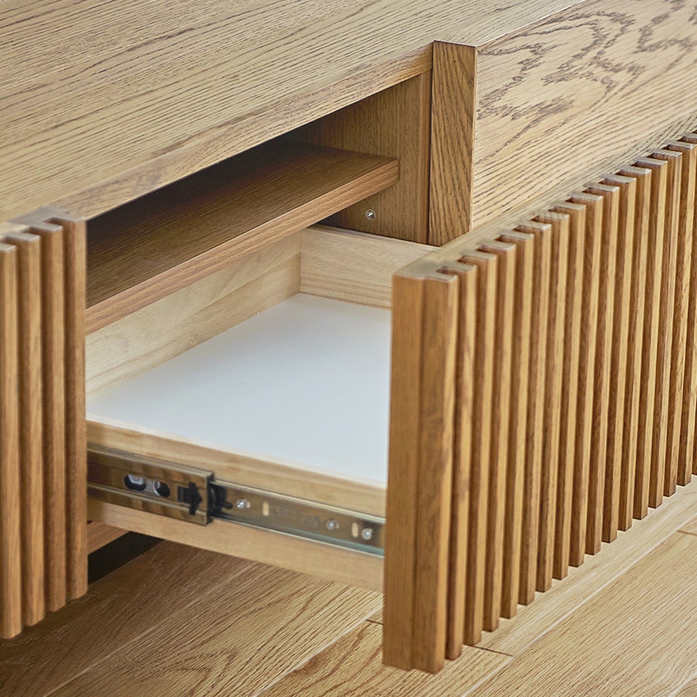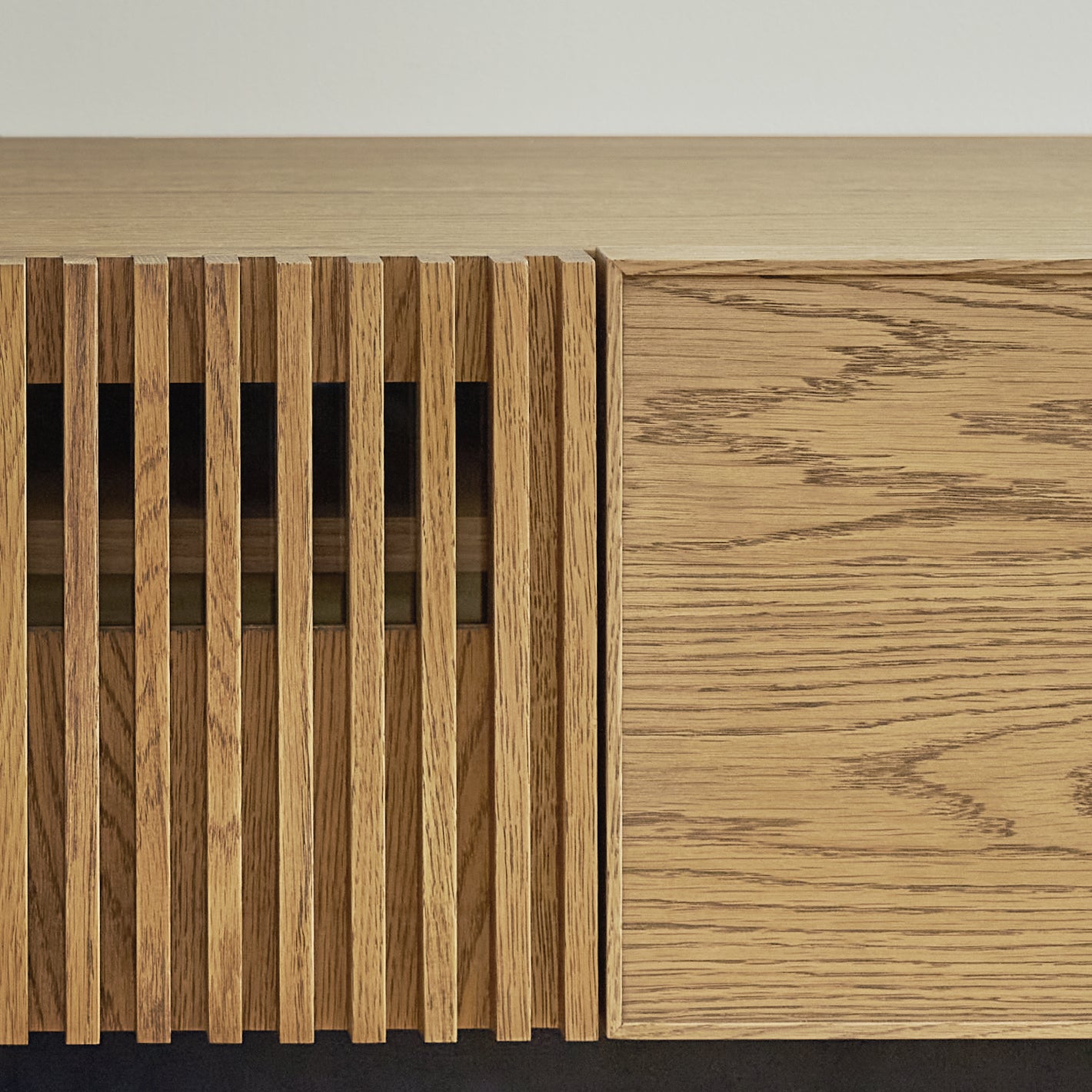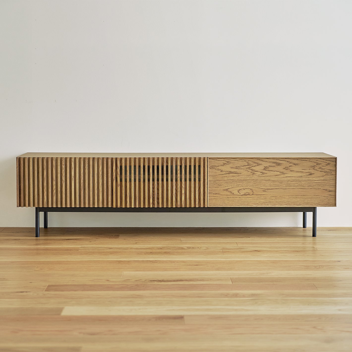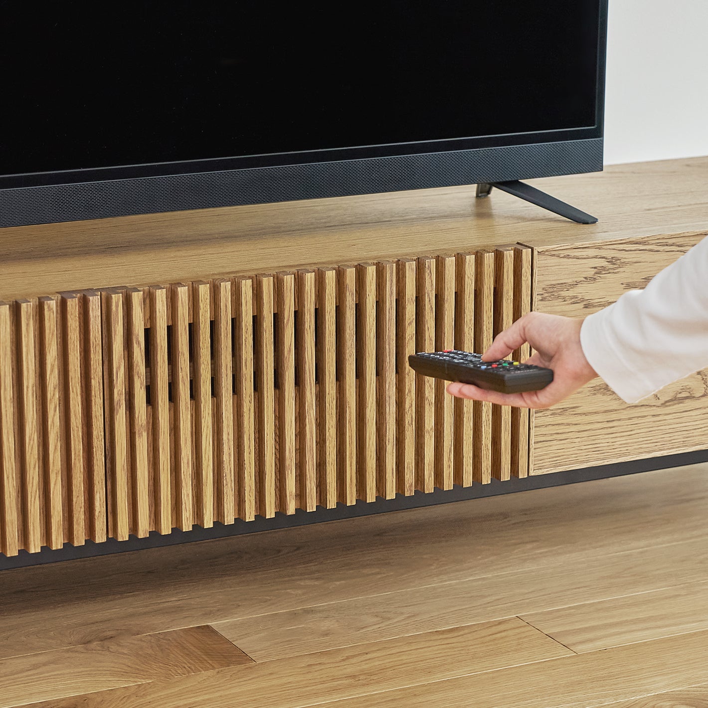 表情豊かなオーク材の素材感と、ルーバーが印象的なTVボード。
