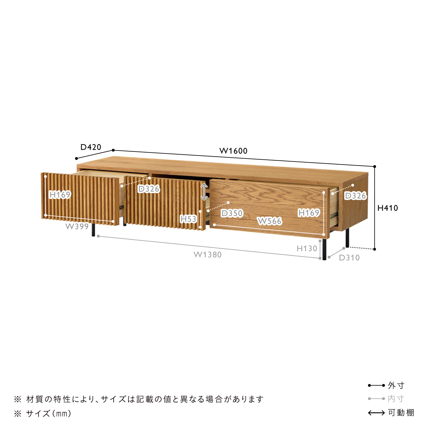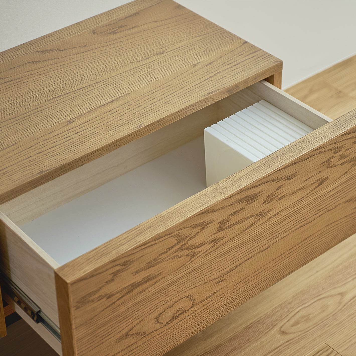 引き出しは可動棚付き。棚板の位置を2段階で調整できます。