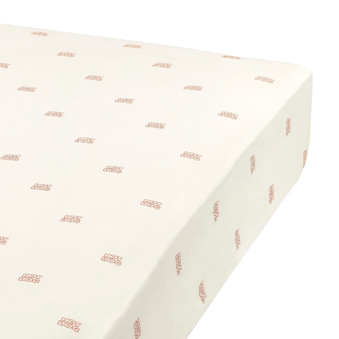 刺繍でポップなフォントをあしらった、ヴィンテージテイストのボックスシーツ。