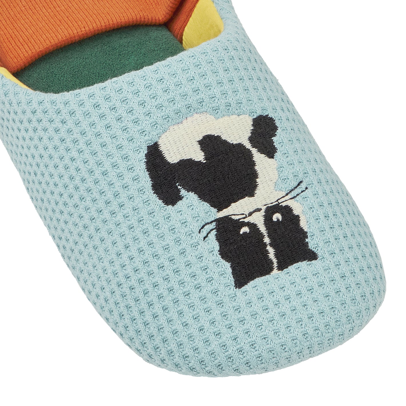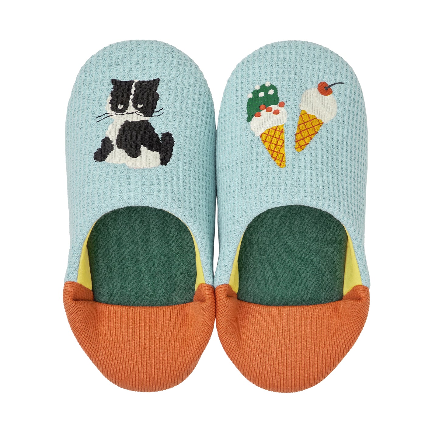 いたずらっぽい表情のネコと、アイスクリームのアップリケを乗せたバブーシュ。