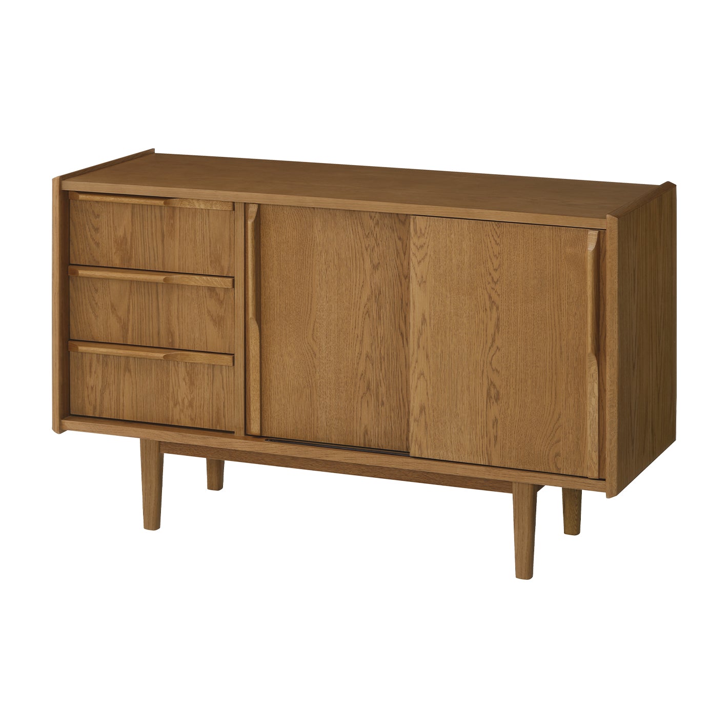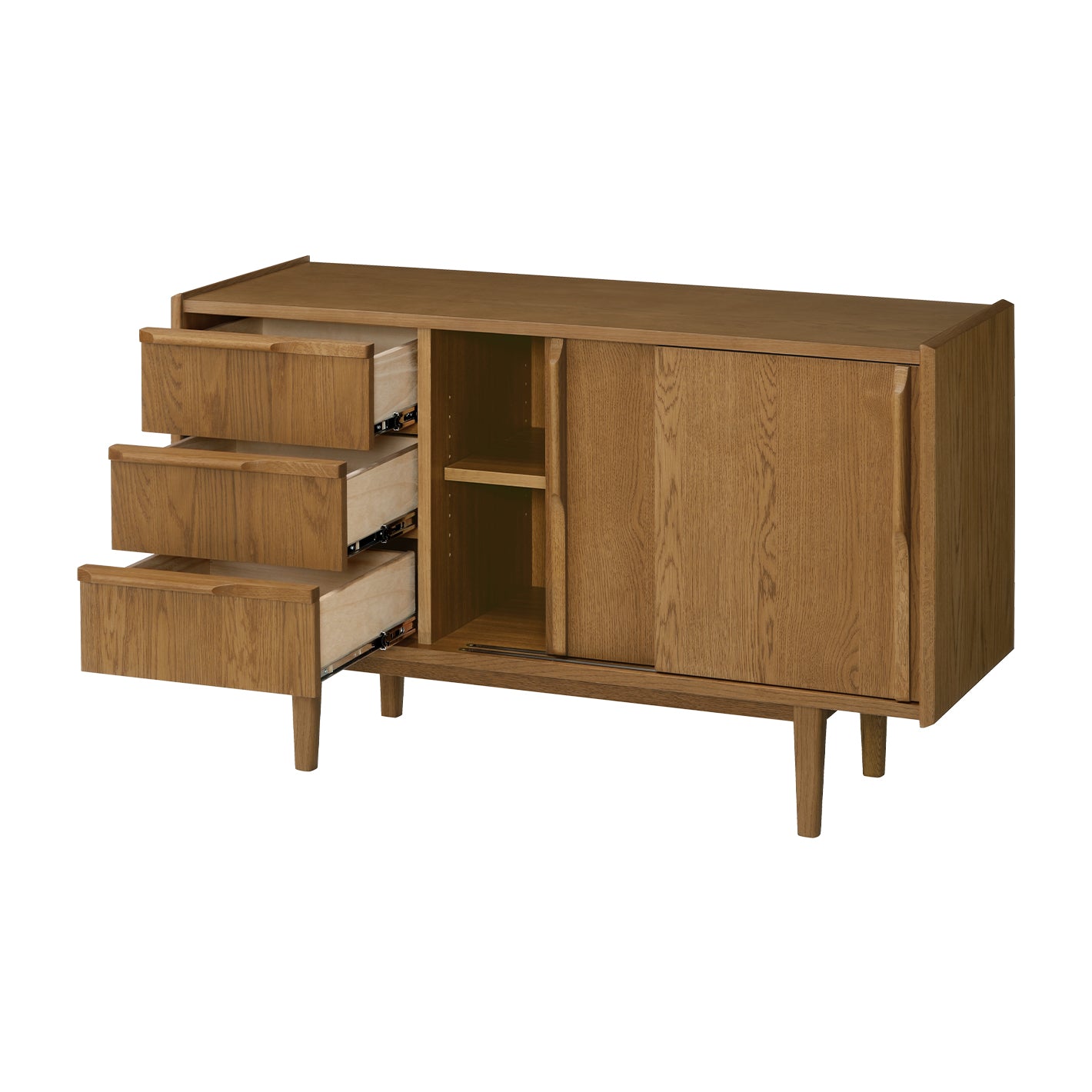 3段の引き出しと、可動式の棚板が付いた引き戸を備え、収納力も充実。
