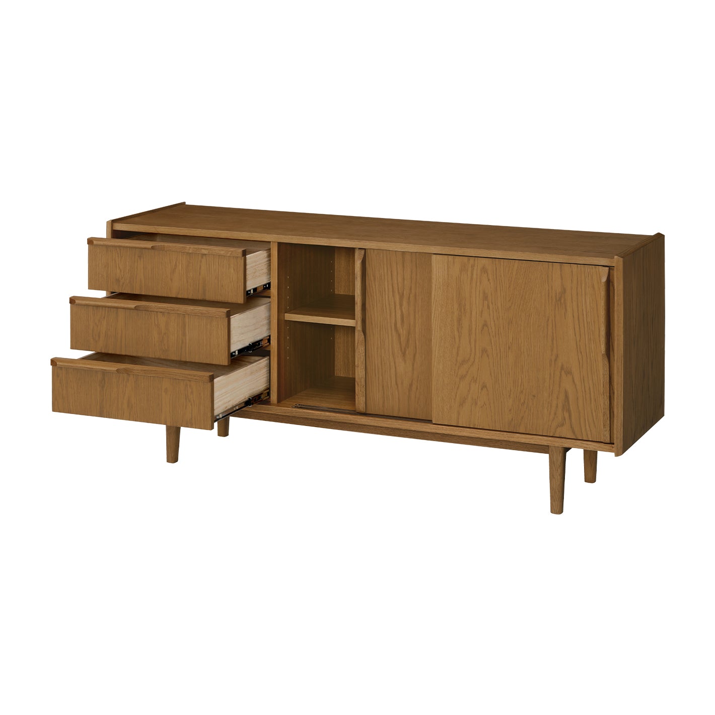 3段の引き出しと可動式の棚板が付いた引き戸を備え、収納力も充実。