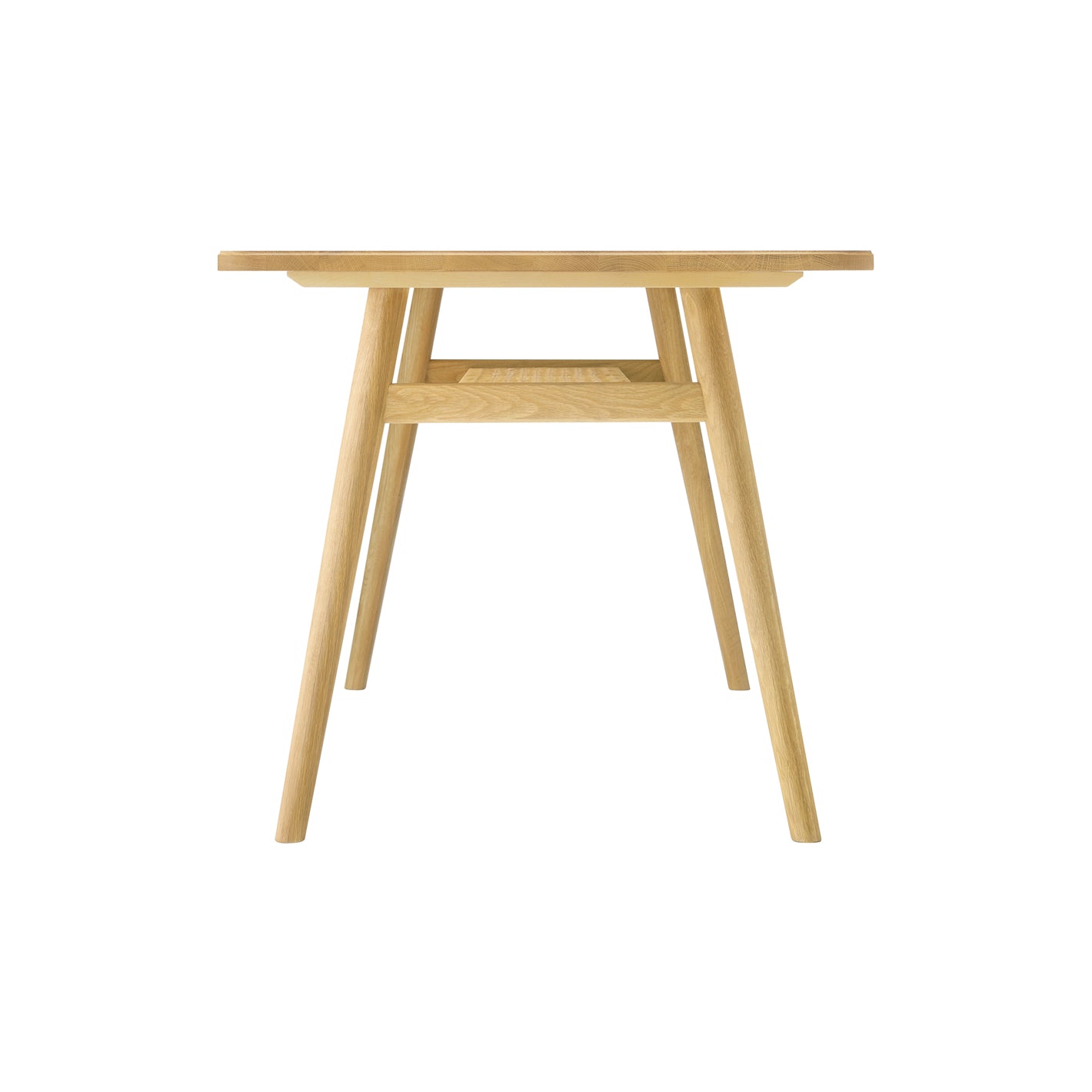 節や木目を活かしたオーク材の素材感と、手編みのラタンの棚板が特徴のダイニングテーブル。