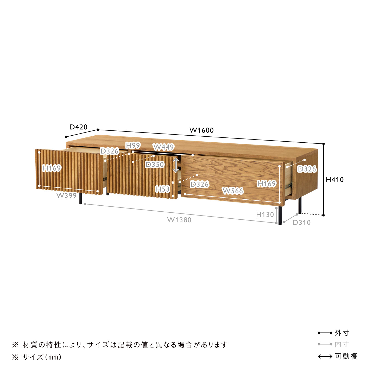 引き出しは可動棚付き。棚板の位置を2段階で調整できます。