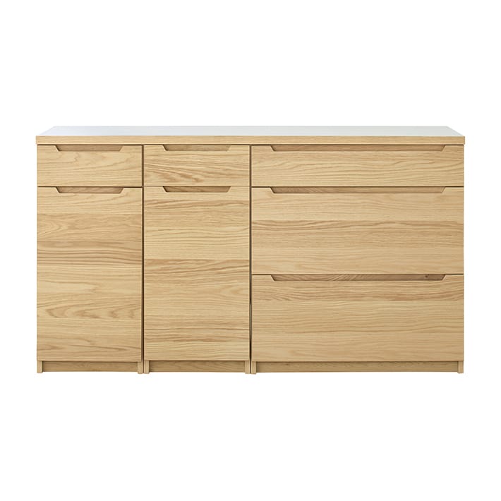 オーク材のナチュラルな素材感を生かした、飽きのこないシンプルなデザインのキッチンカウンター。