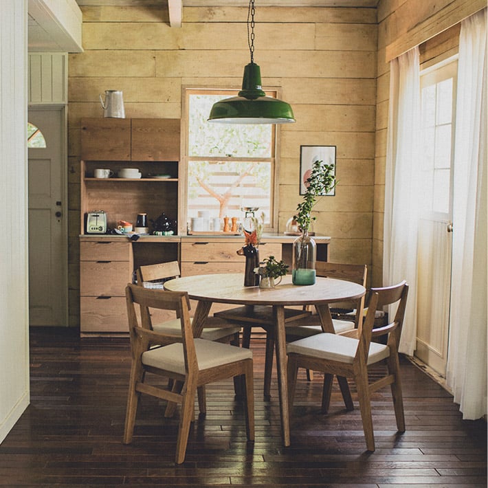 木目や節など、オーク材の表情を生かしたカジュアルな印象のダイニング。