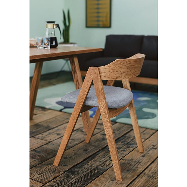 天然木の素材感が引き立つデザイン。シンプルながら、すっきりとしたシャープな脚部や、丸みのある背もたれ、短めのアームなど、細部のデザインにもこだわっています。