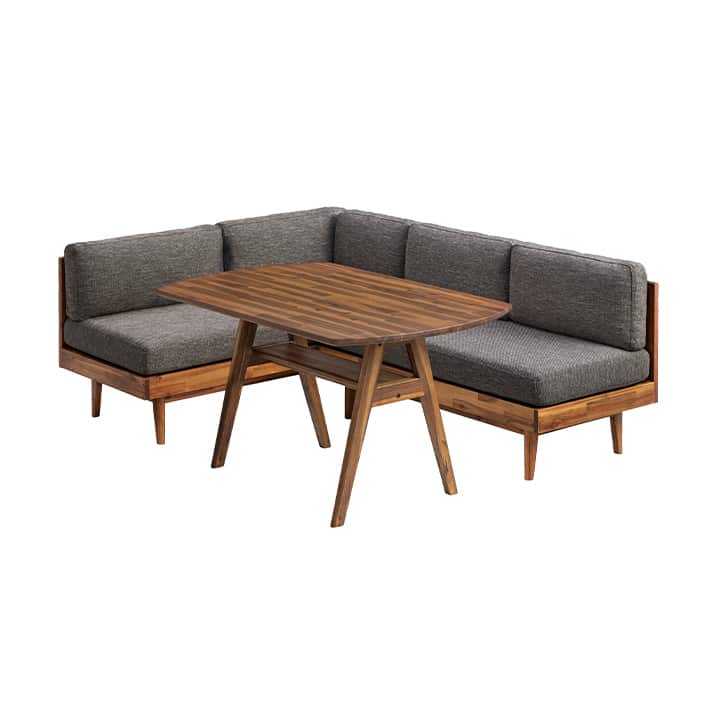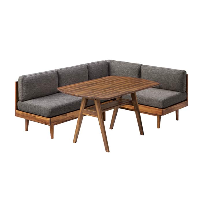 アカシア材やアイアン、ストーンウォッシュ加工のデニム生地など、素材から細部の仕上げにまでこだわったデザインです。