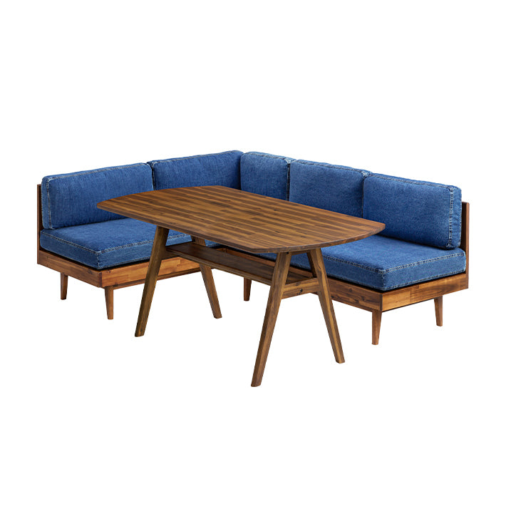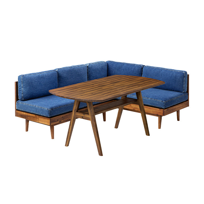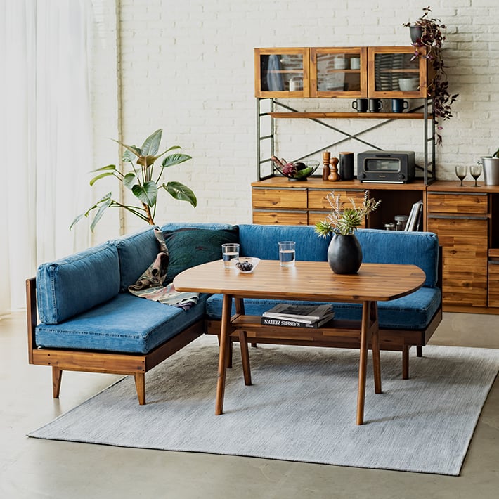 アカシア材やアイアン、ストーンウォッシュ加工のデニム生地など、素材から細部の仕上げにまでこだわったデザインです。