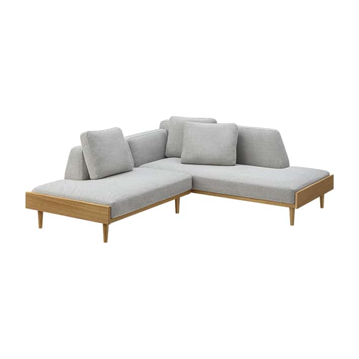 フレームにオーク材を使用した、背もたれが低く、圧迫感の少ないカウチソファ。