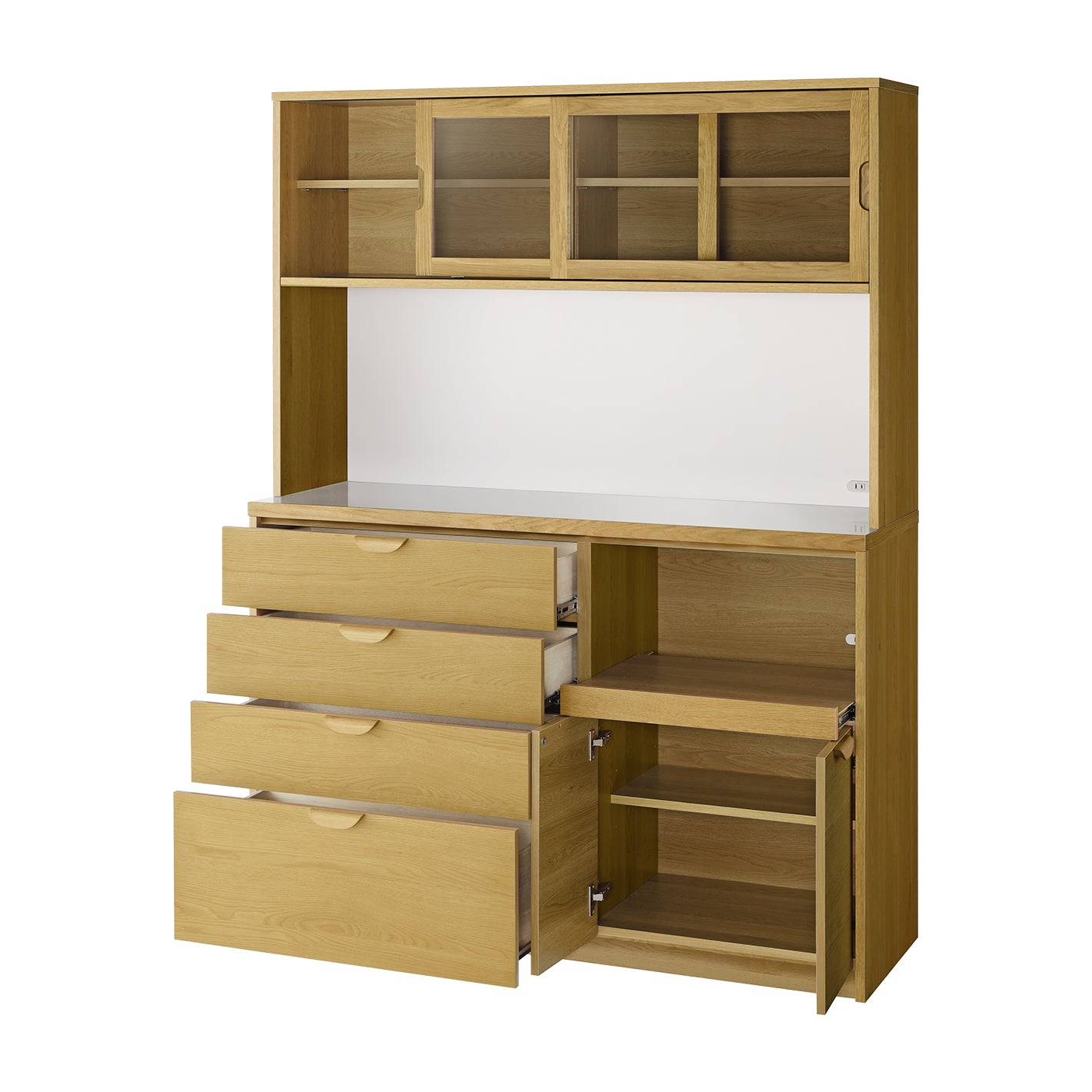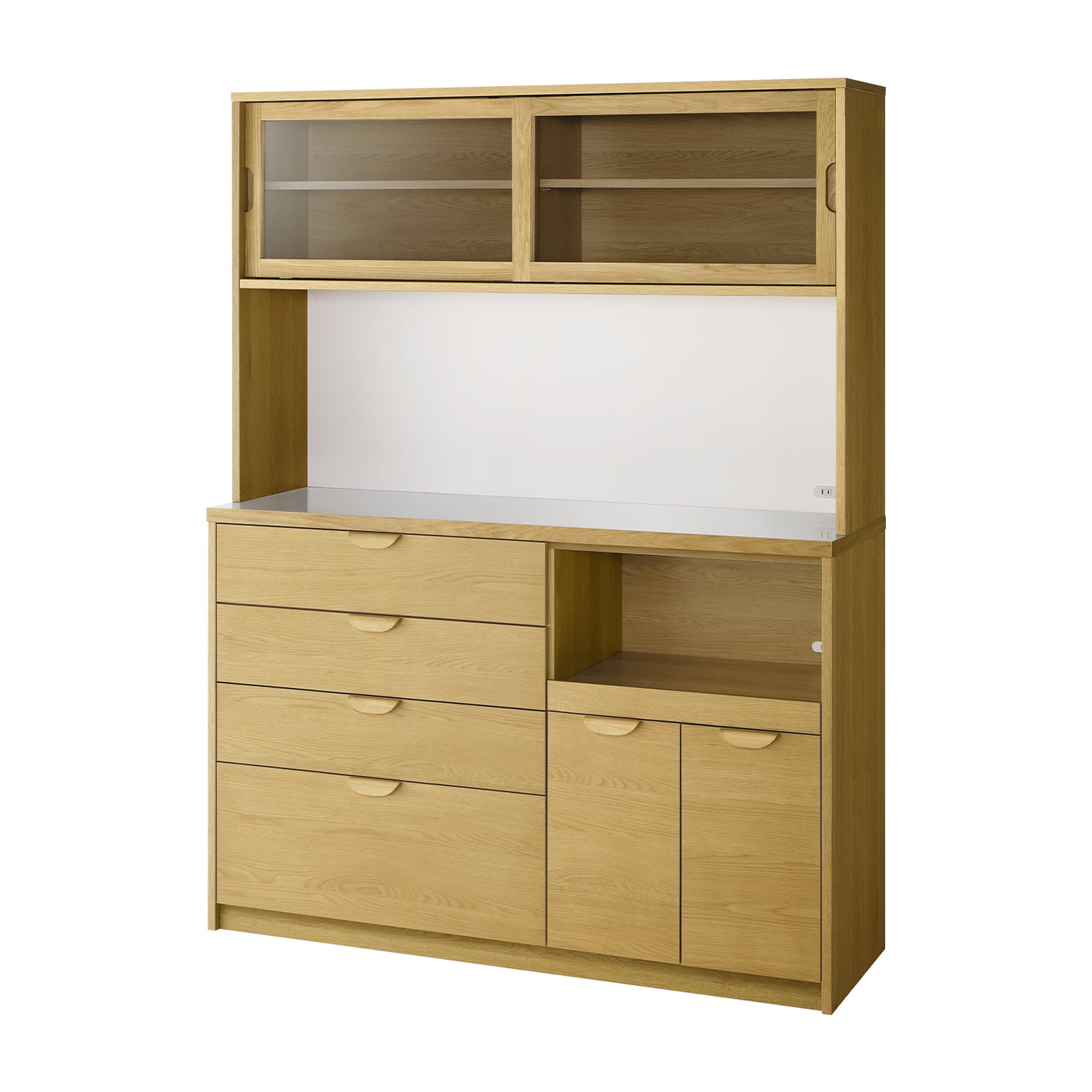 上台は、中が見えるガラス引き戸。お気に入りの食器などを置いて、見せる収納をお楽しみいただけます。