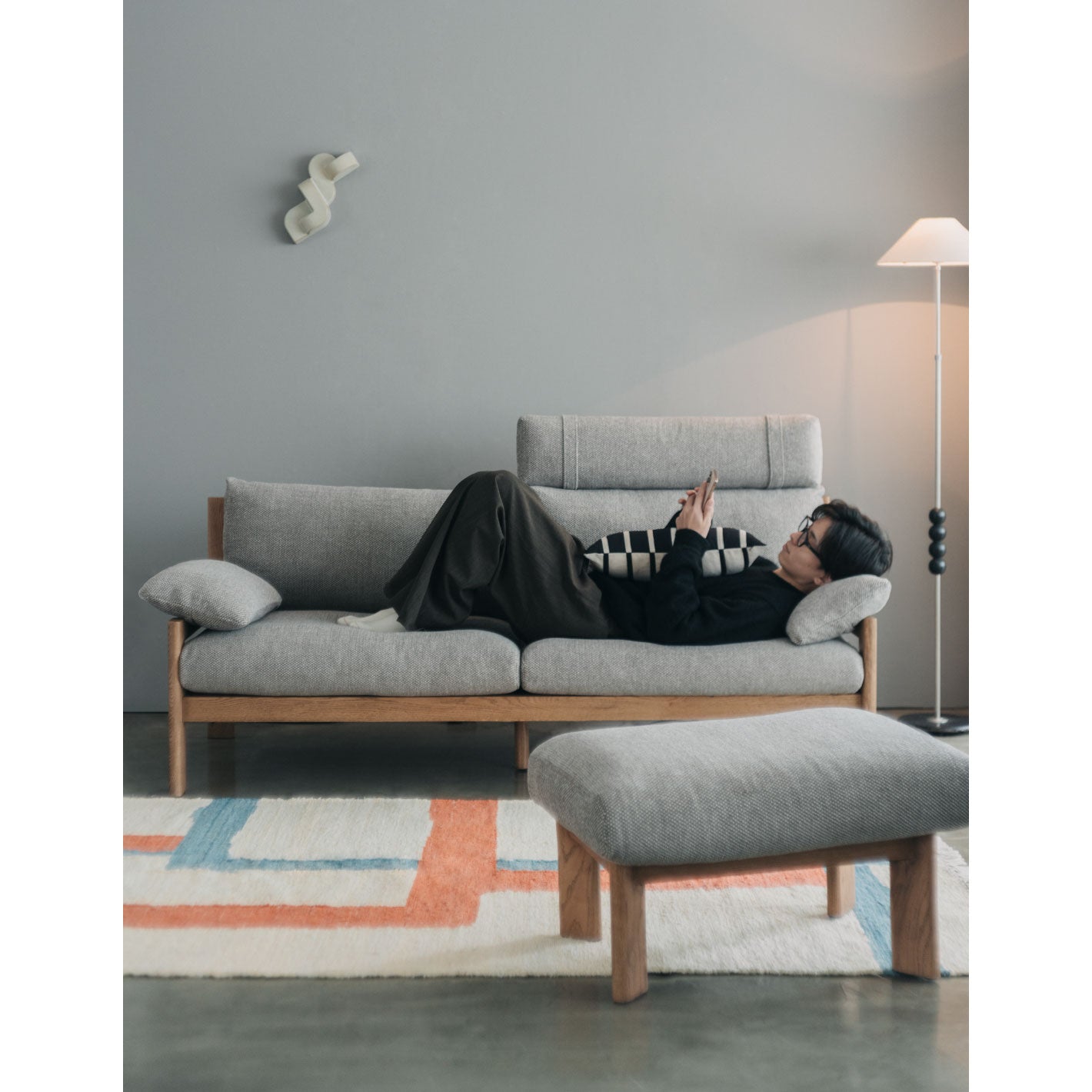 HOLIカバーリングオットマンを組み合わせると、脚を伸ばしてよりゆったりとくつろげます。