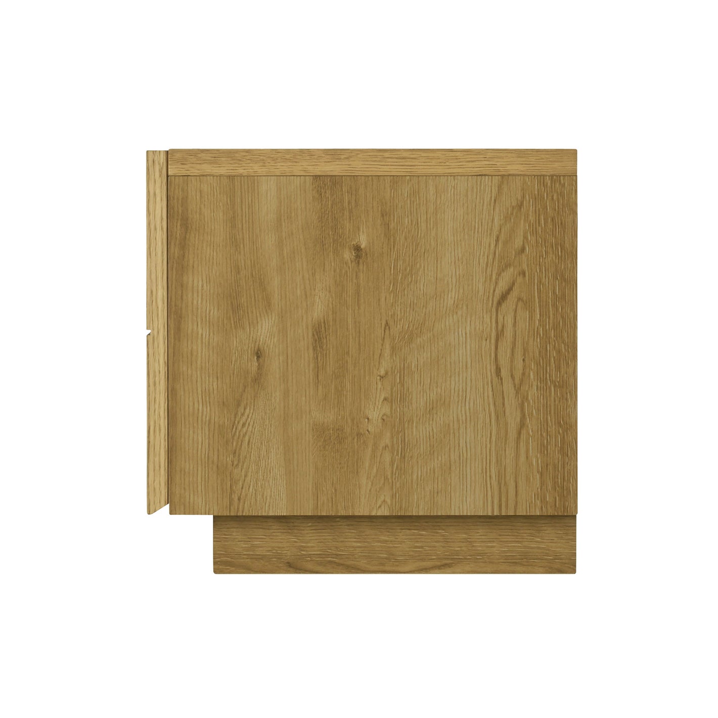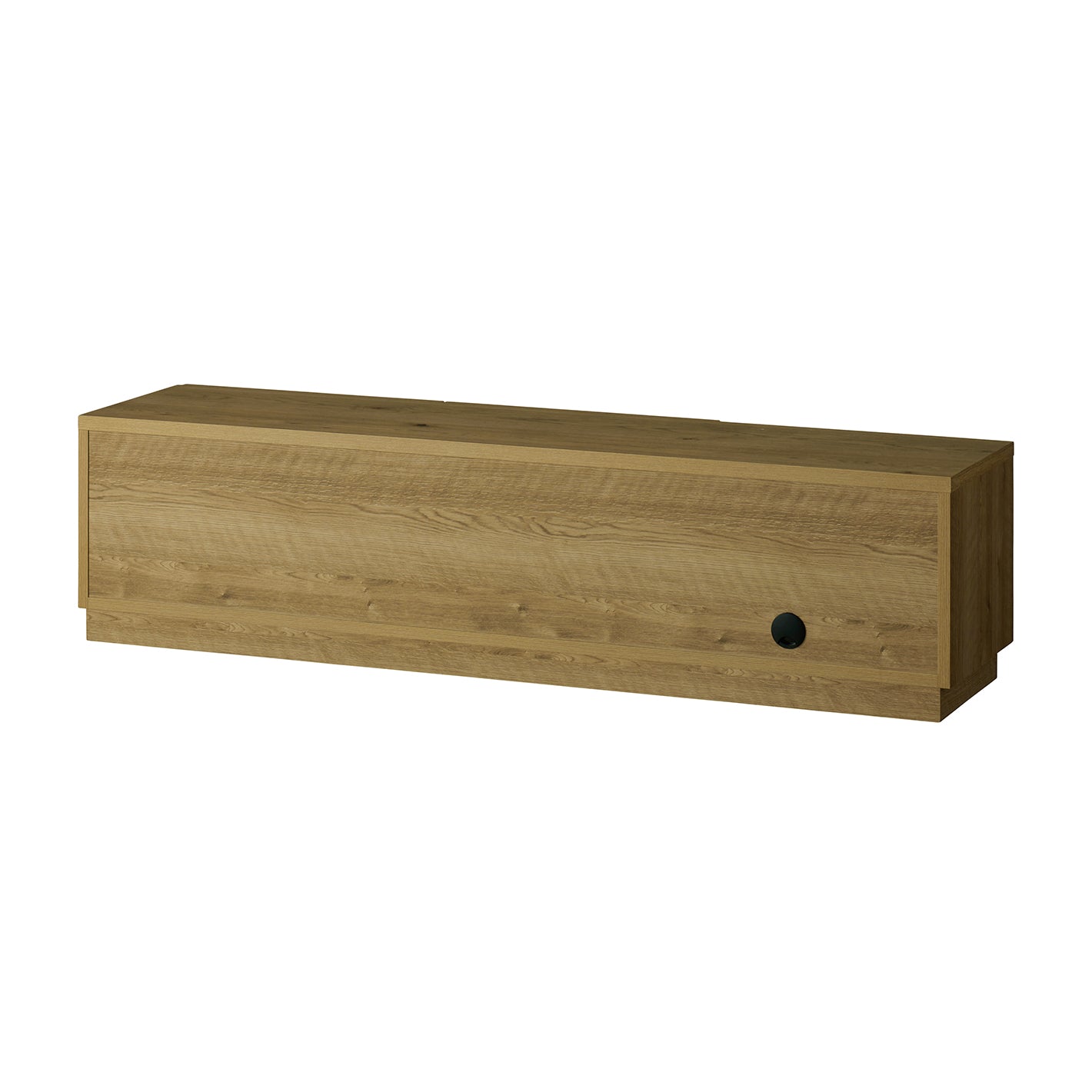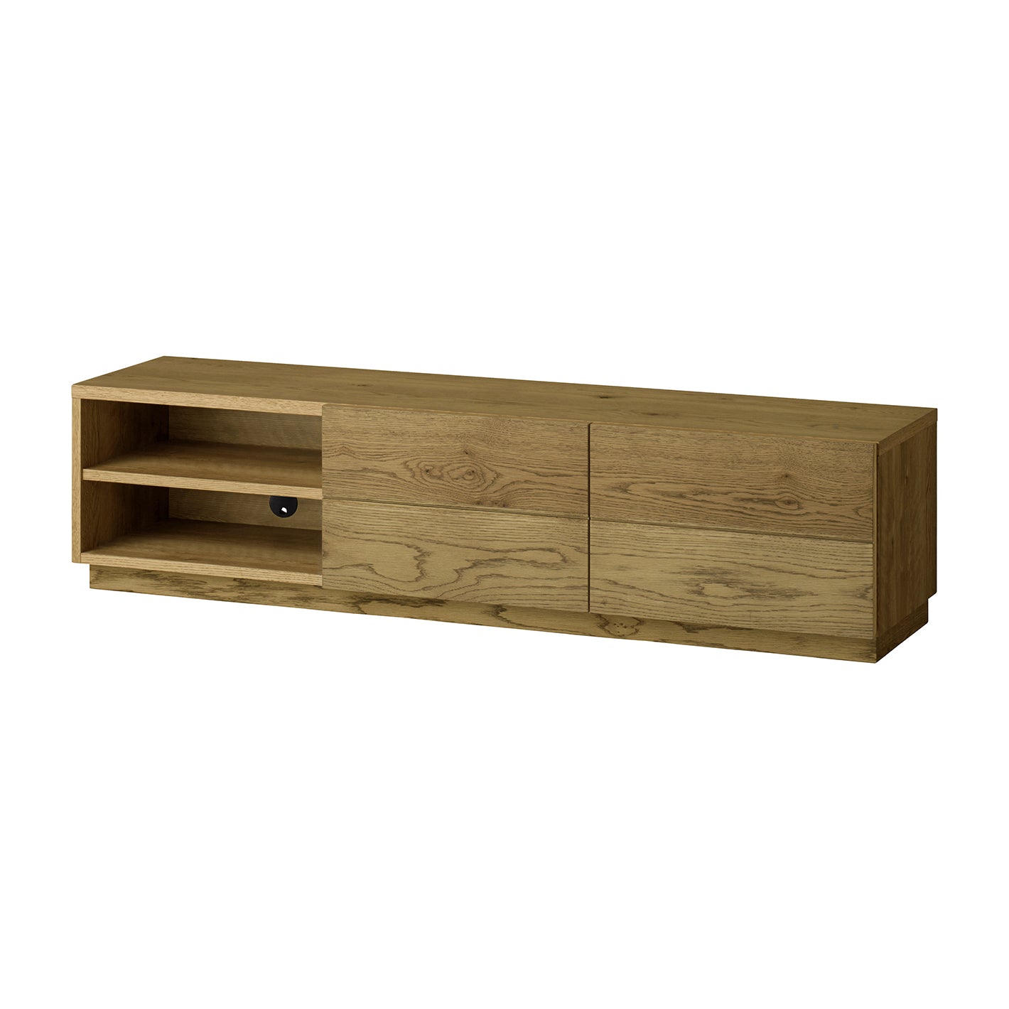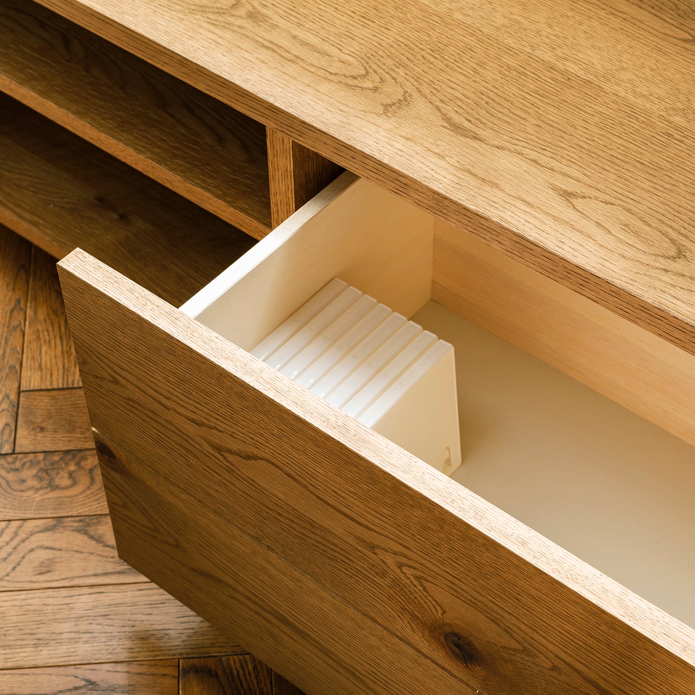 単体ではもちろん、TVサイドシェルフと組み合わせて使えるデザイン。視線が集まるテレビまわりをすっきりとした印象にしてくれます。底目地仕上げでラインを走らせた引き出しはフルオープンタイプで深さがあり、たくさんの物を収納できます。