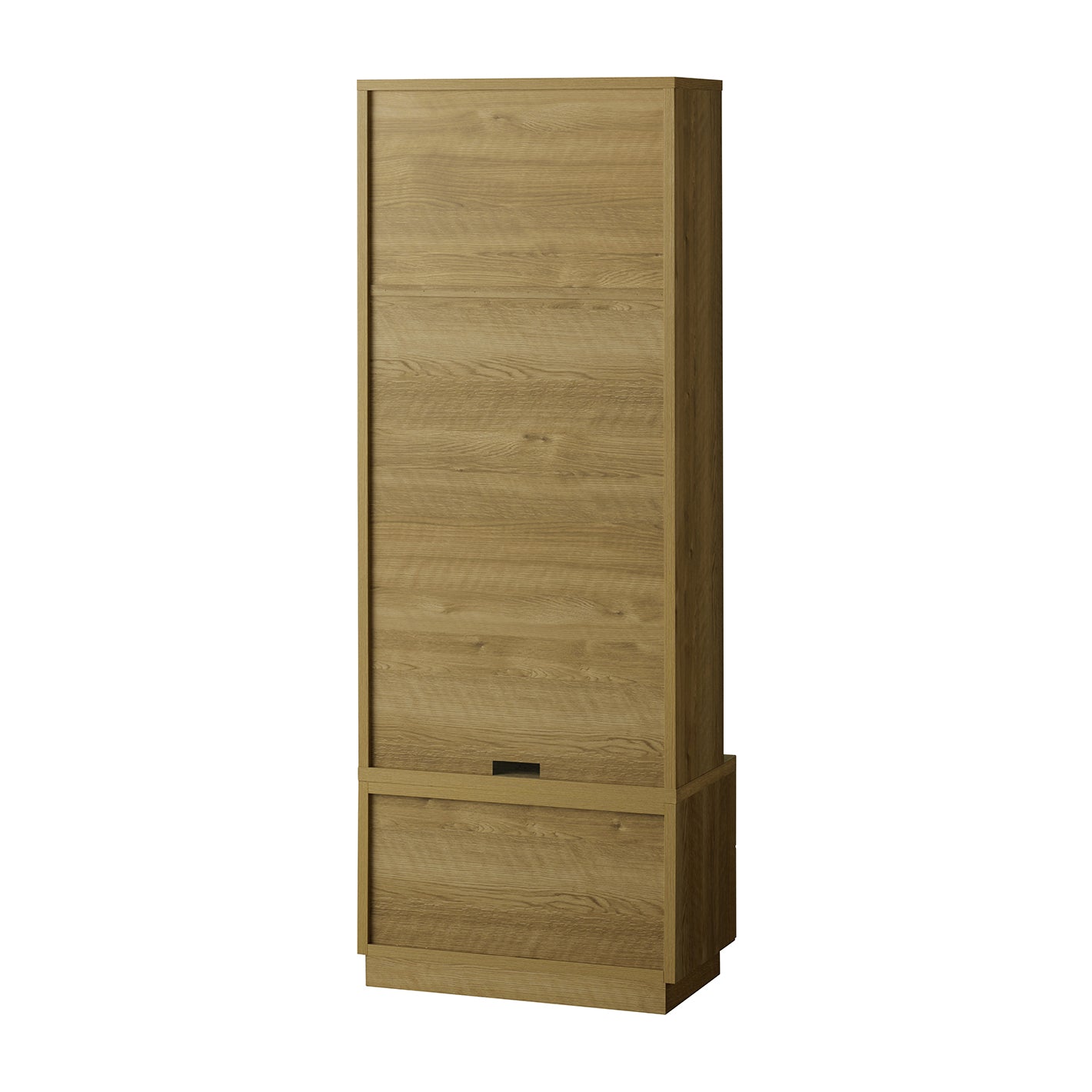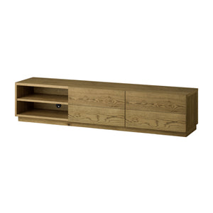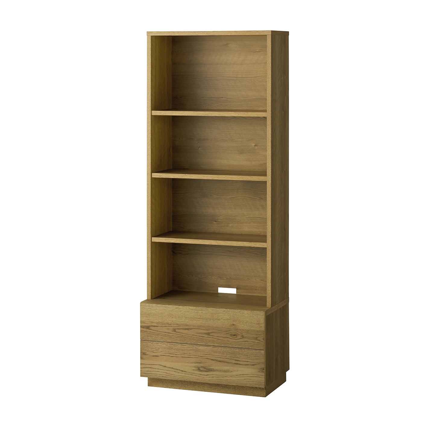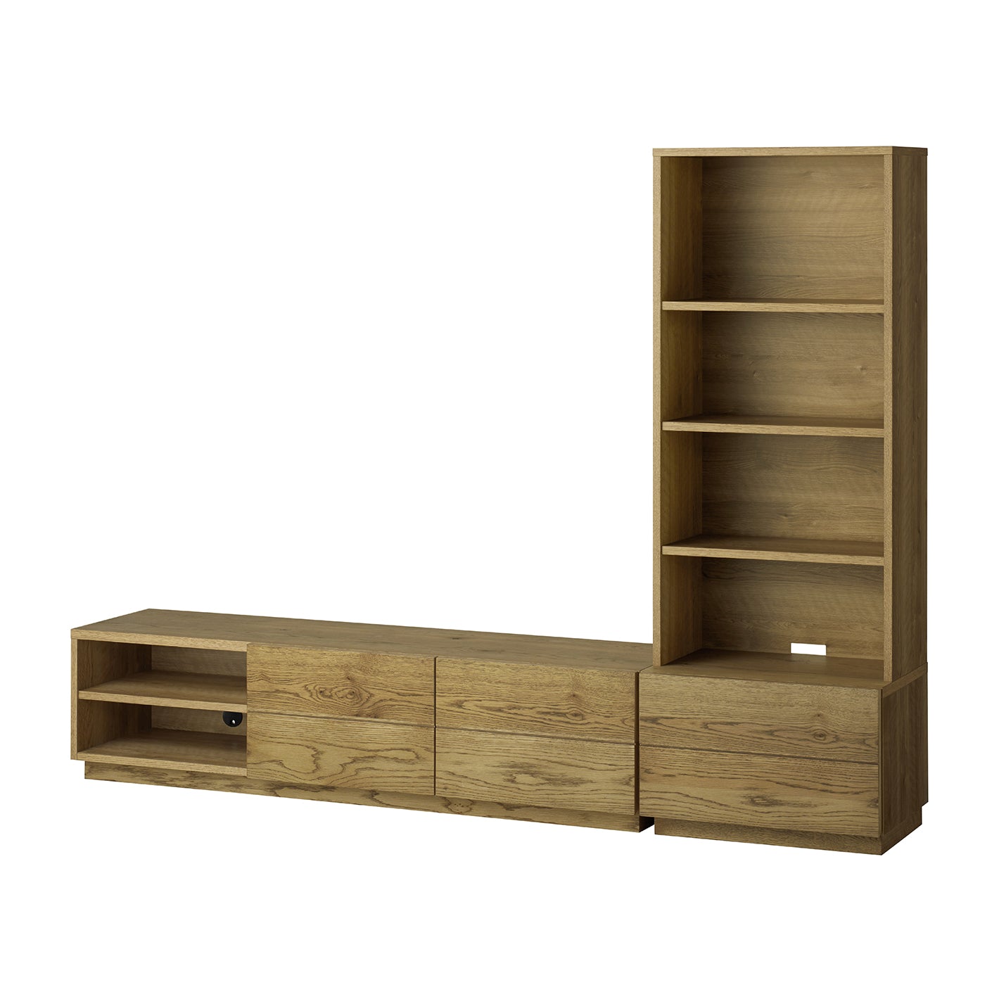 単体ではもちろん、TVボードと組み合わせて使えるデザイン。視線が集まるテレビまわりをすっきりとした印象にしてくれます。棚板は下2枚が可動式で、バックパネルとの間に2cmの隙間があるためケーブル類を通すのに便利です。底目地仕上げでラインを走らせた下段の引き出しは深さがあり、たくさんの物を収納できます。