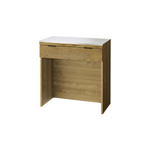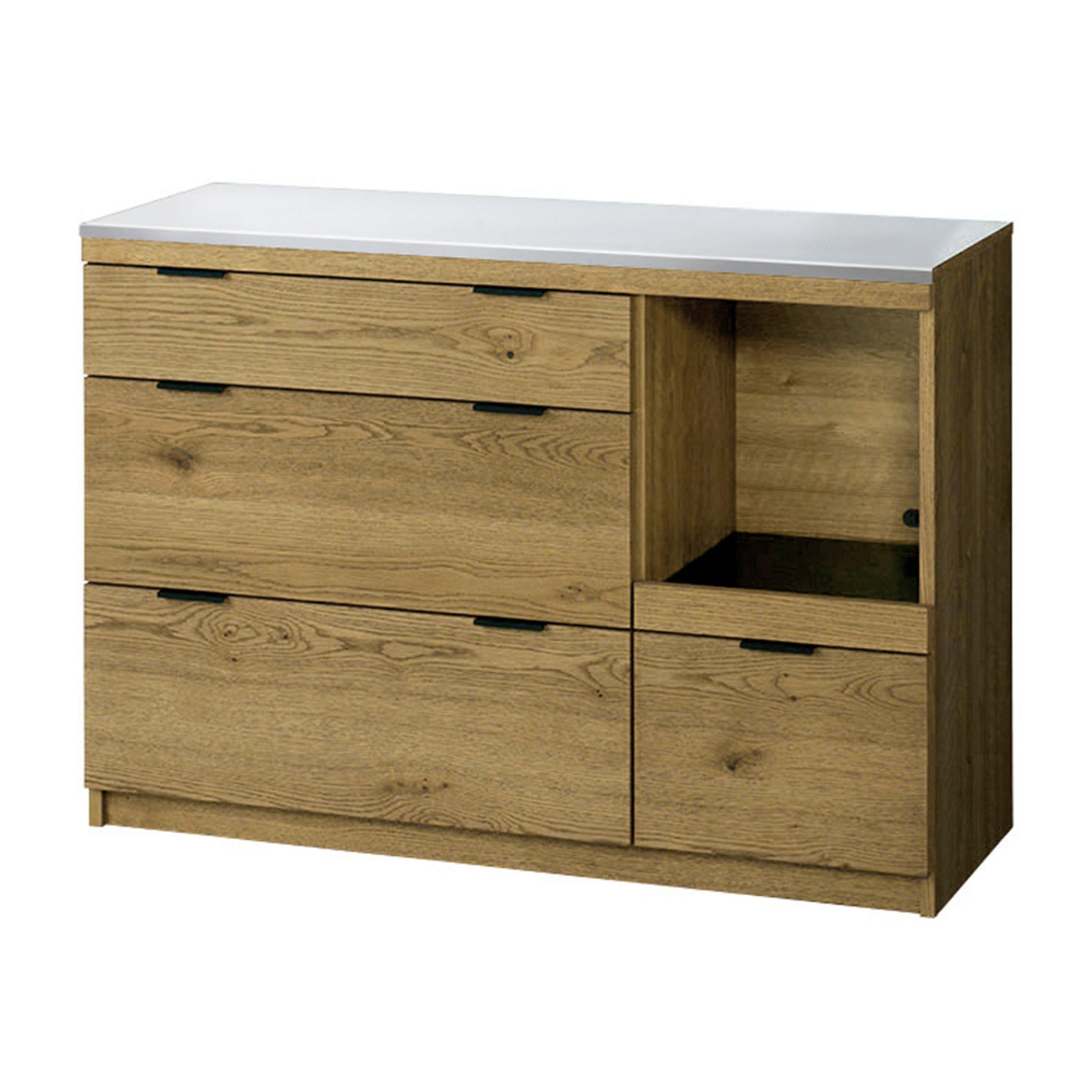 ブラックアルミの取っ手がシャープな印象を与えるアクセントに。傷が目立ちにくいステンレスの天板は耐久性が高く、日々のお手入れに便利です。引き出しには、調理器具やこまごました物をたっぷりしまって。コンセント付きの便利なスライド棚には、家電をすっきり収納できます。