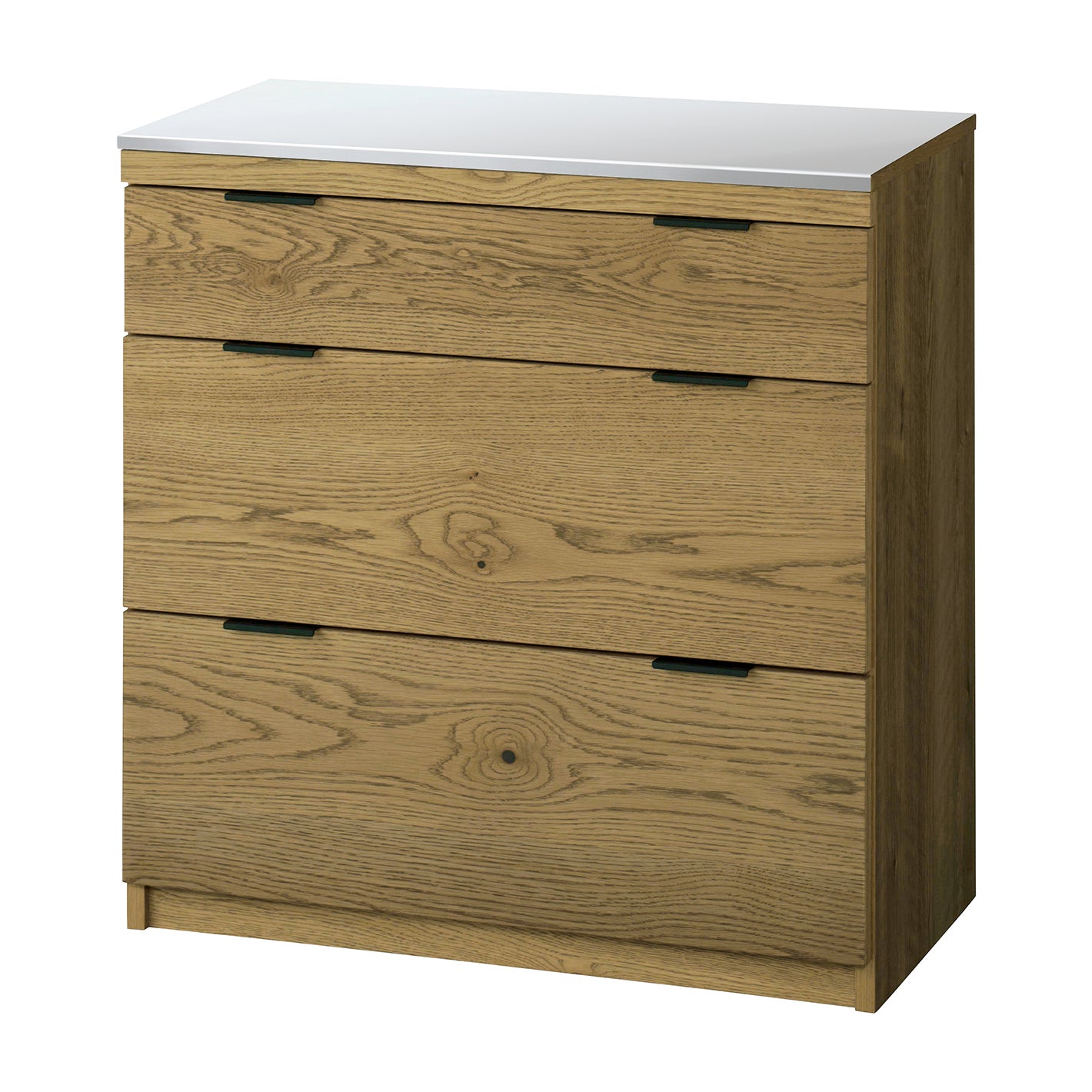 こちらは、ADDAYキッチンカウンターのオープン部分を引き出し仕様に変更したカスタムオーダー品です。スライド棚を引き出しにすることで、木目や節など、木の表情を生かしたよりカジュアルな雰囲気を楽しめます。