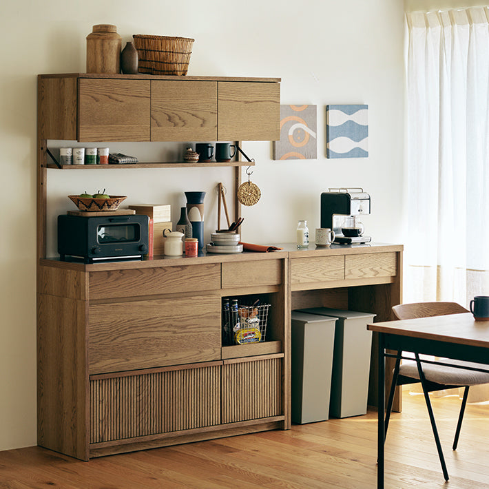 側板がないため圧迫感が少なく、ダストタイプのDIFEキッチンボードを並べれば、造り付けの吊り戸のような雰囲気に。