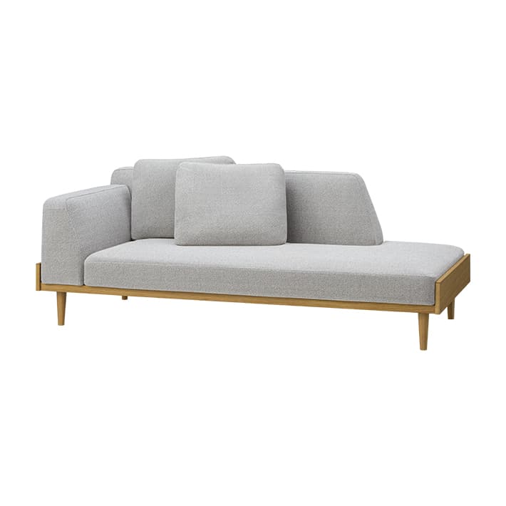 フレームにオーク材を使用した、背もたれが低く、圧迫感の少ないソファ。