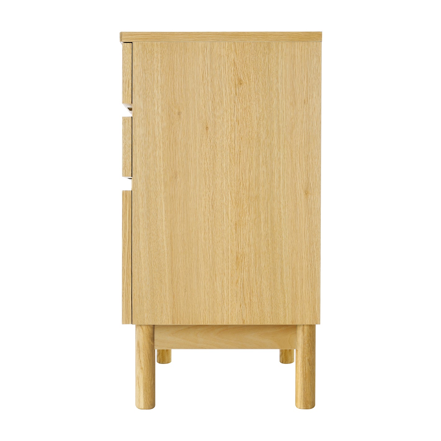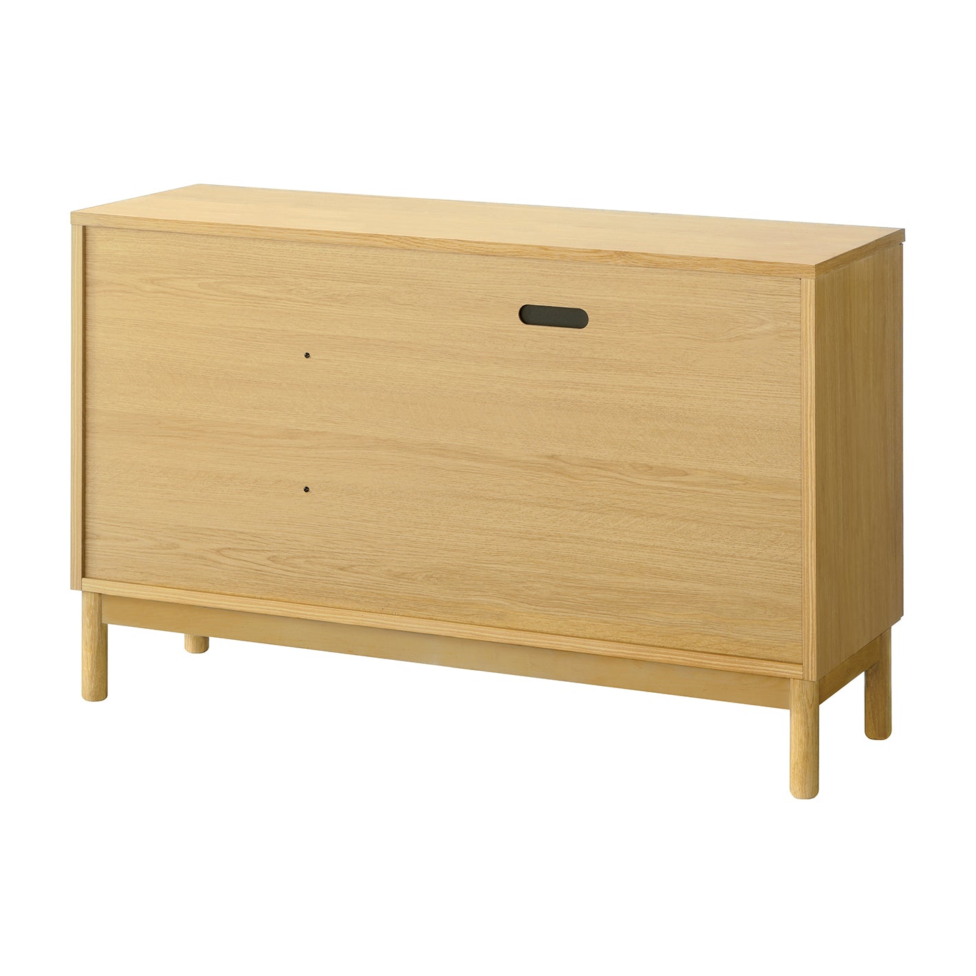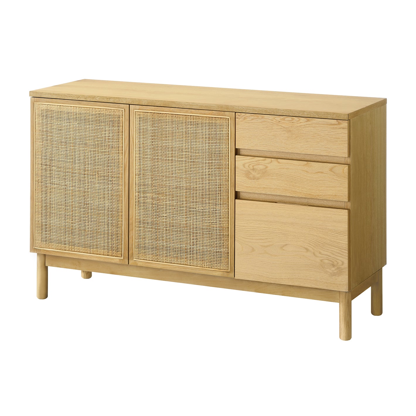 オーク材にラタンを組み合わせた、カジュアルな印象のキャビネット。