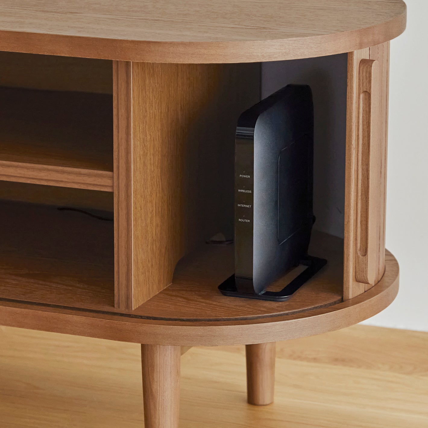底板には、ケーブルを通せるコンセントホール付き。端の収納スペースも配線が通せるようになっており、電子機器などを目立たない形で収納できます。