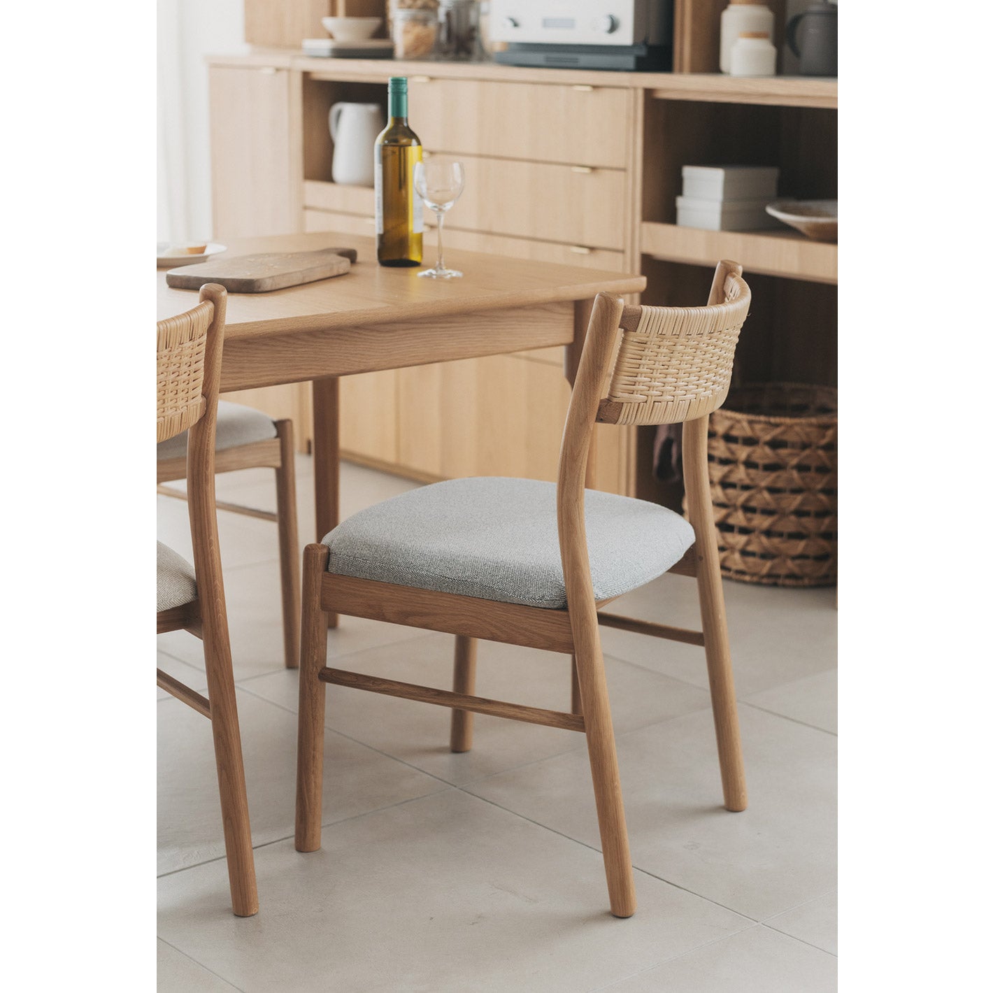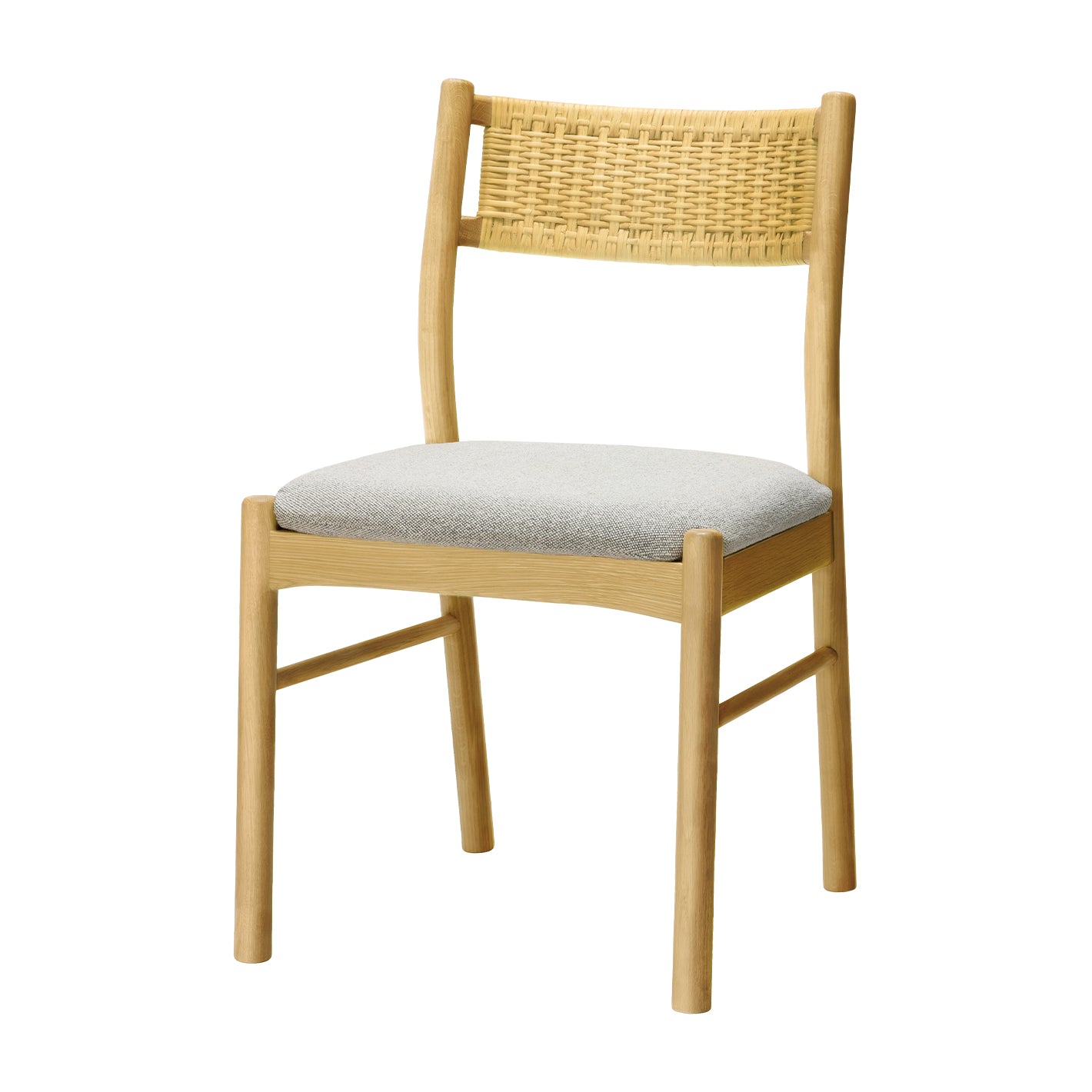 背もたれのラタンがアクセントになった、シンプルなデザインのチェア。