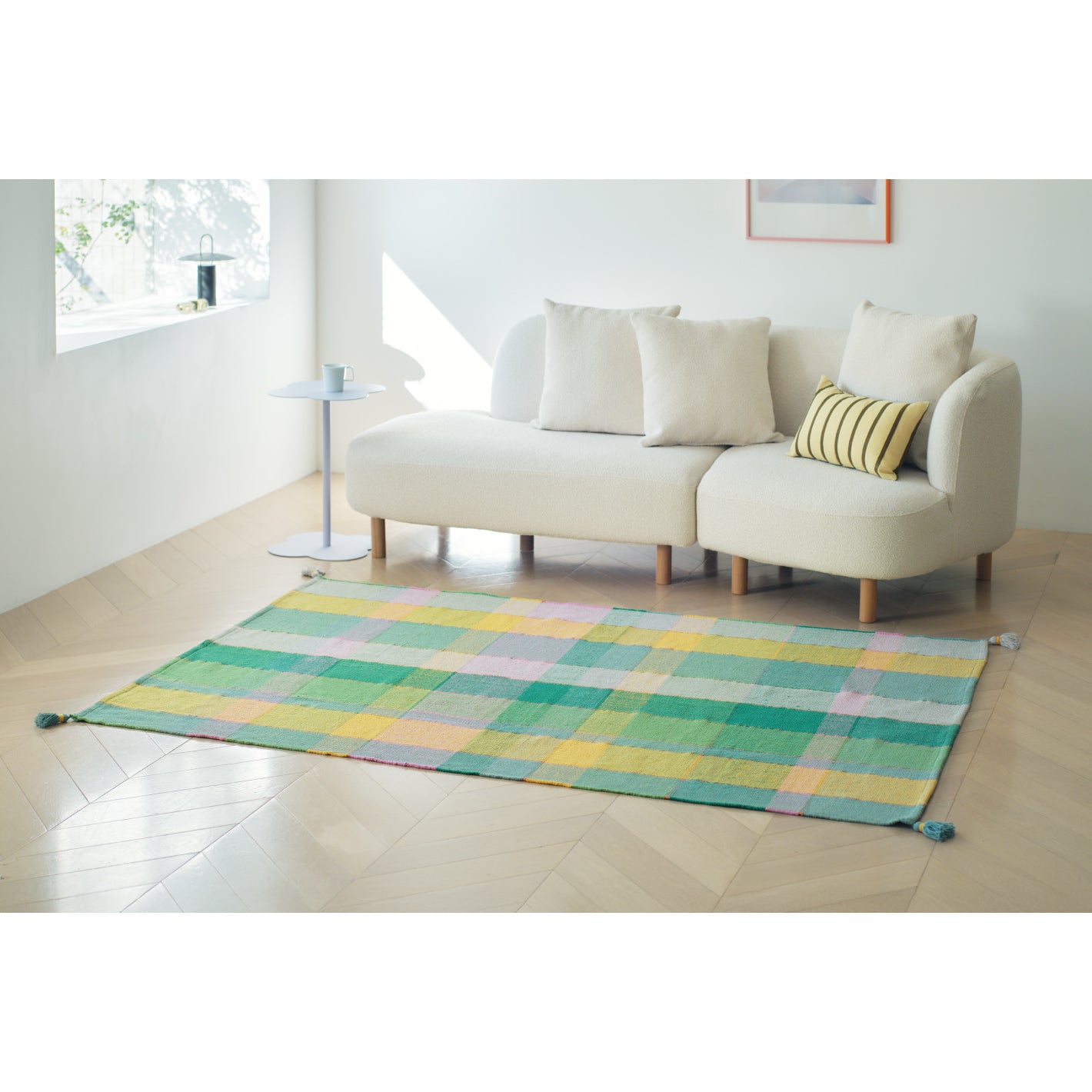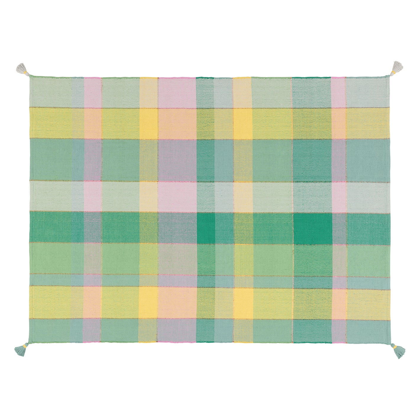 インドの職人が手織りで仕上げた、カラフルなチェック柄のラグ。