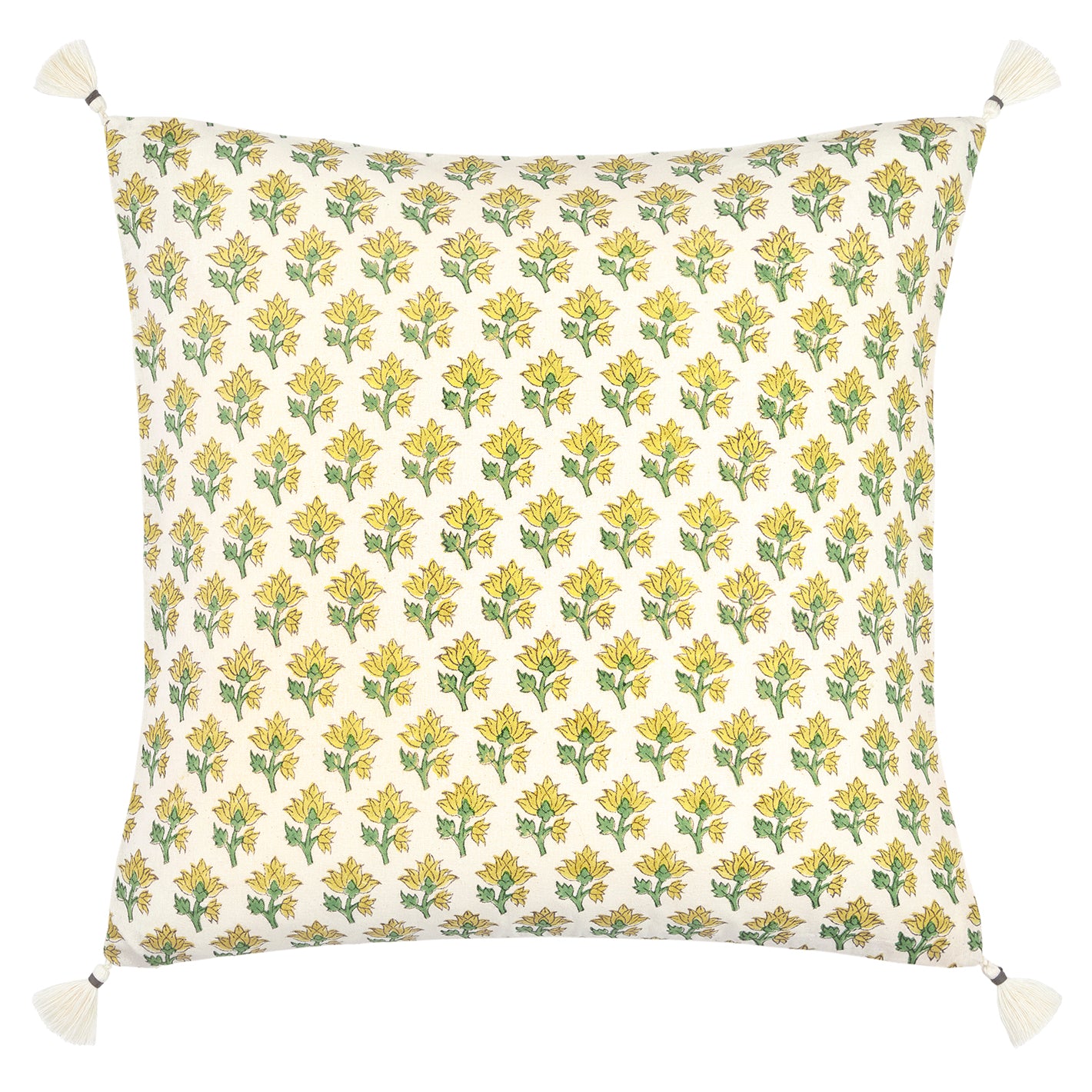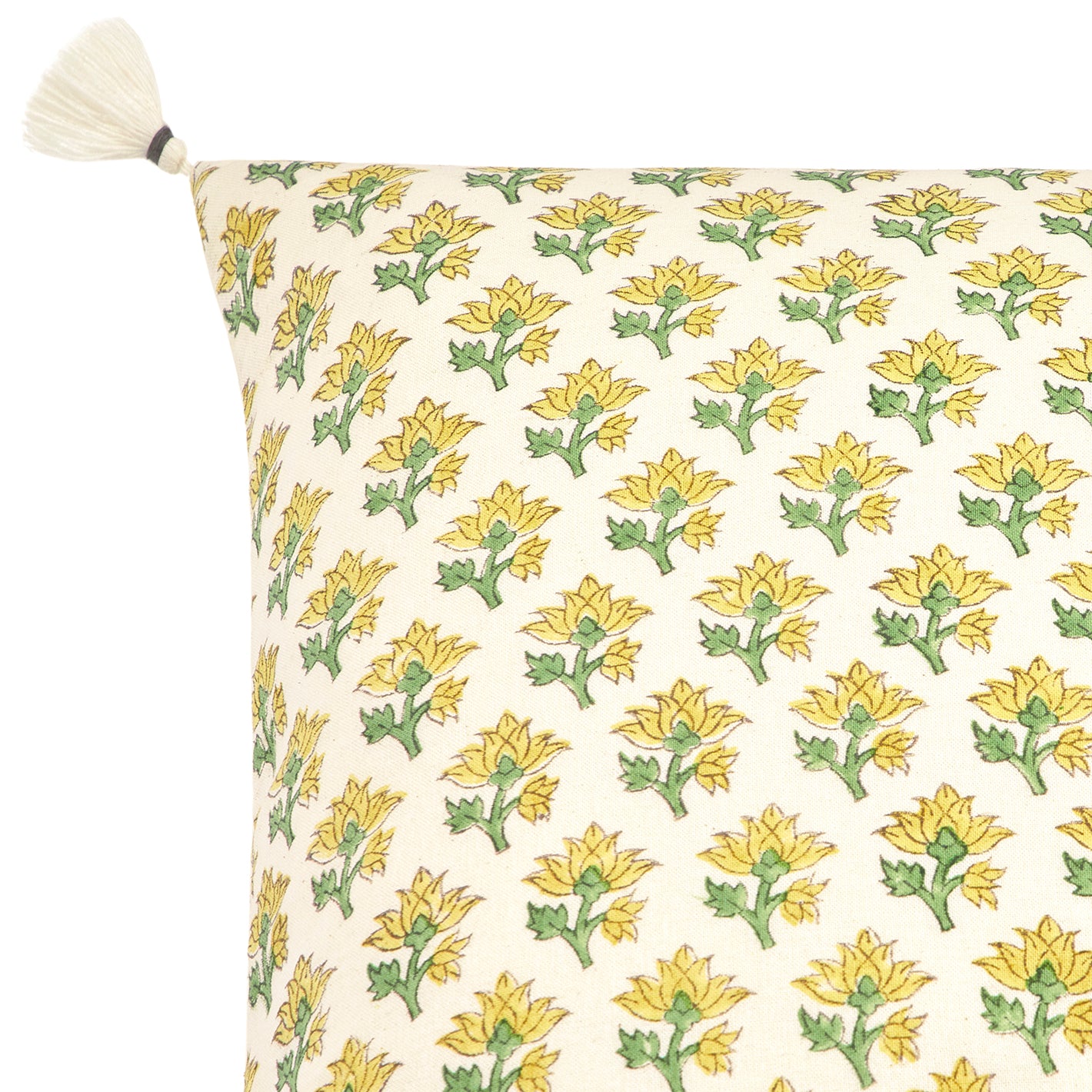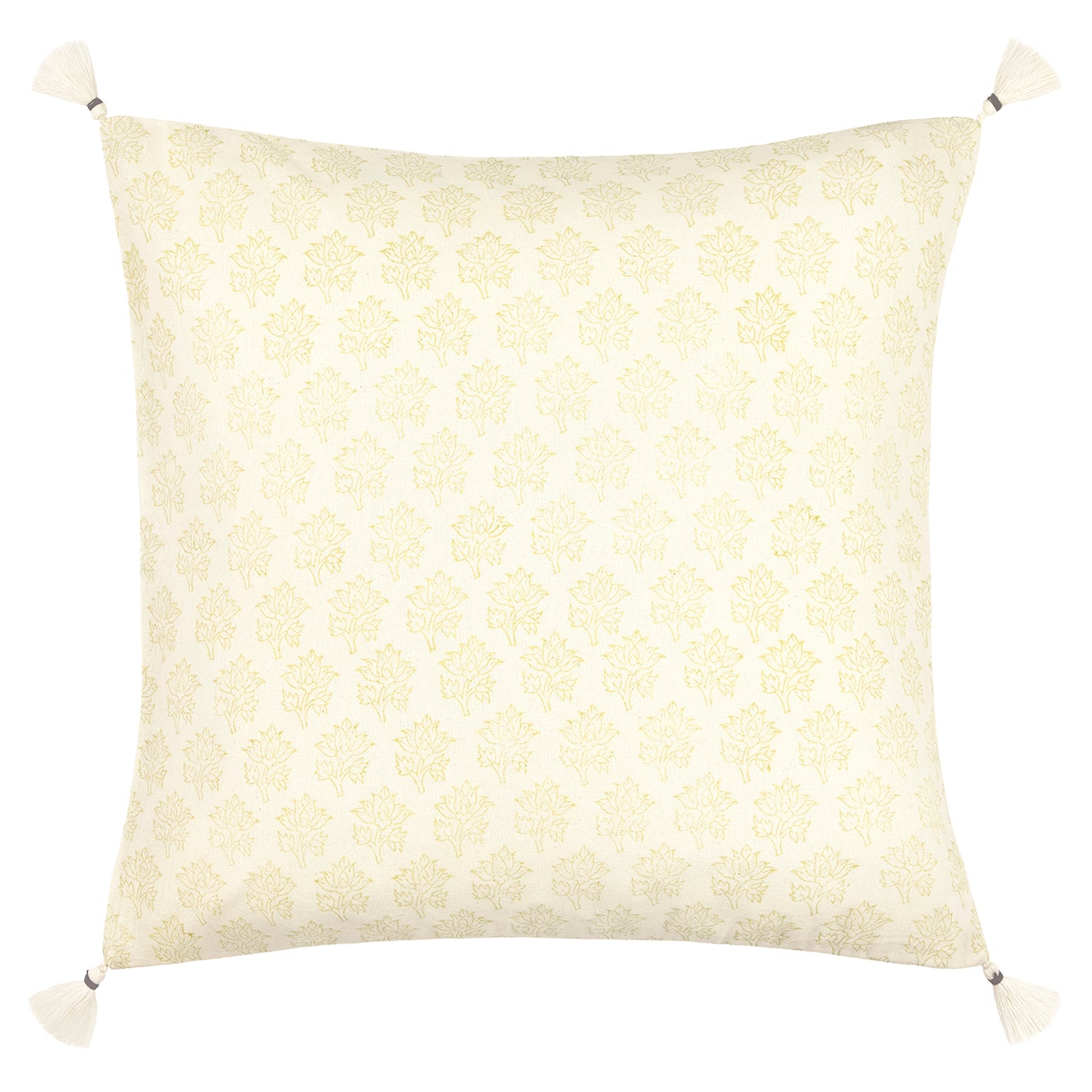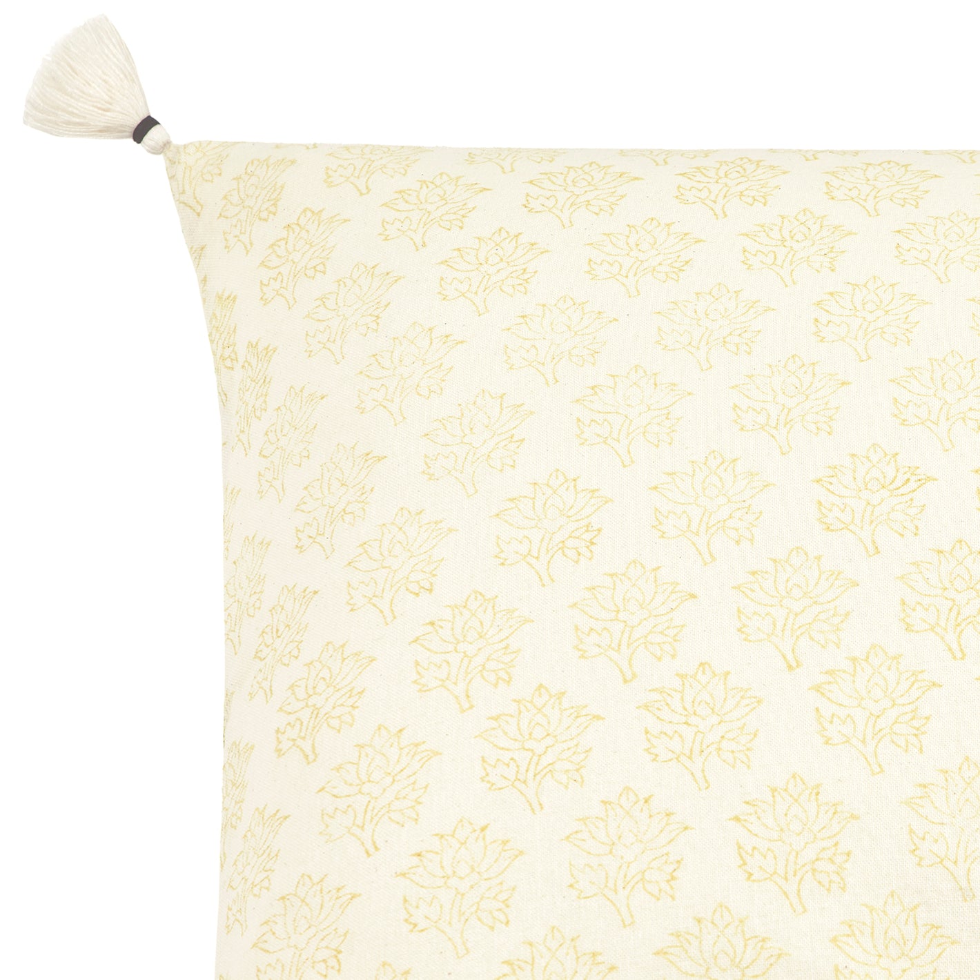 インドの伝統的な技法であるブロックプリントで仕上げた、花柄のクッションカバー。