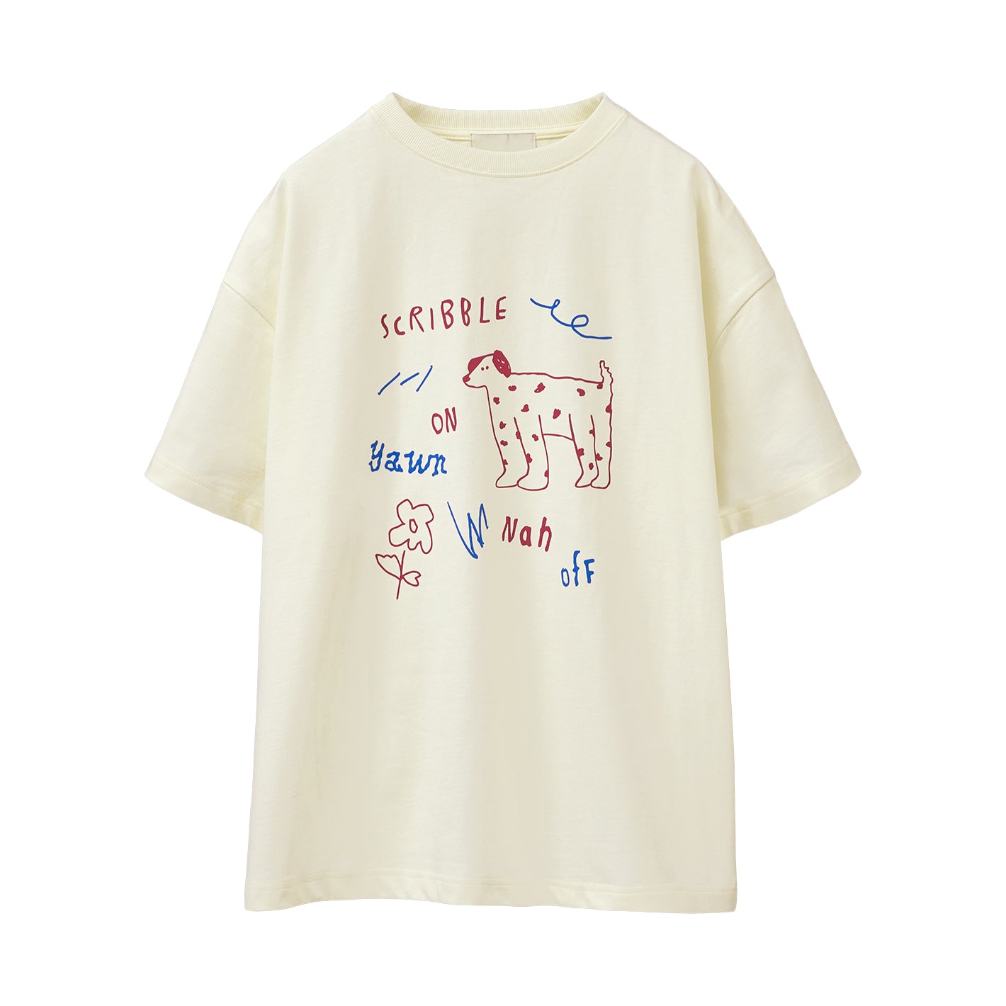 犬やお花のイラストを、ゆるいタッチで描いたデザインのTシャツ。