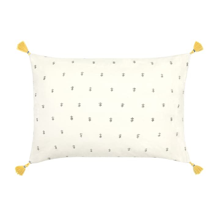 アシンメトリーに配したパイピングと、四方のタッセルがデザインのアクセントに。