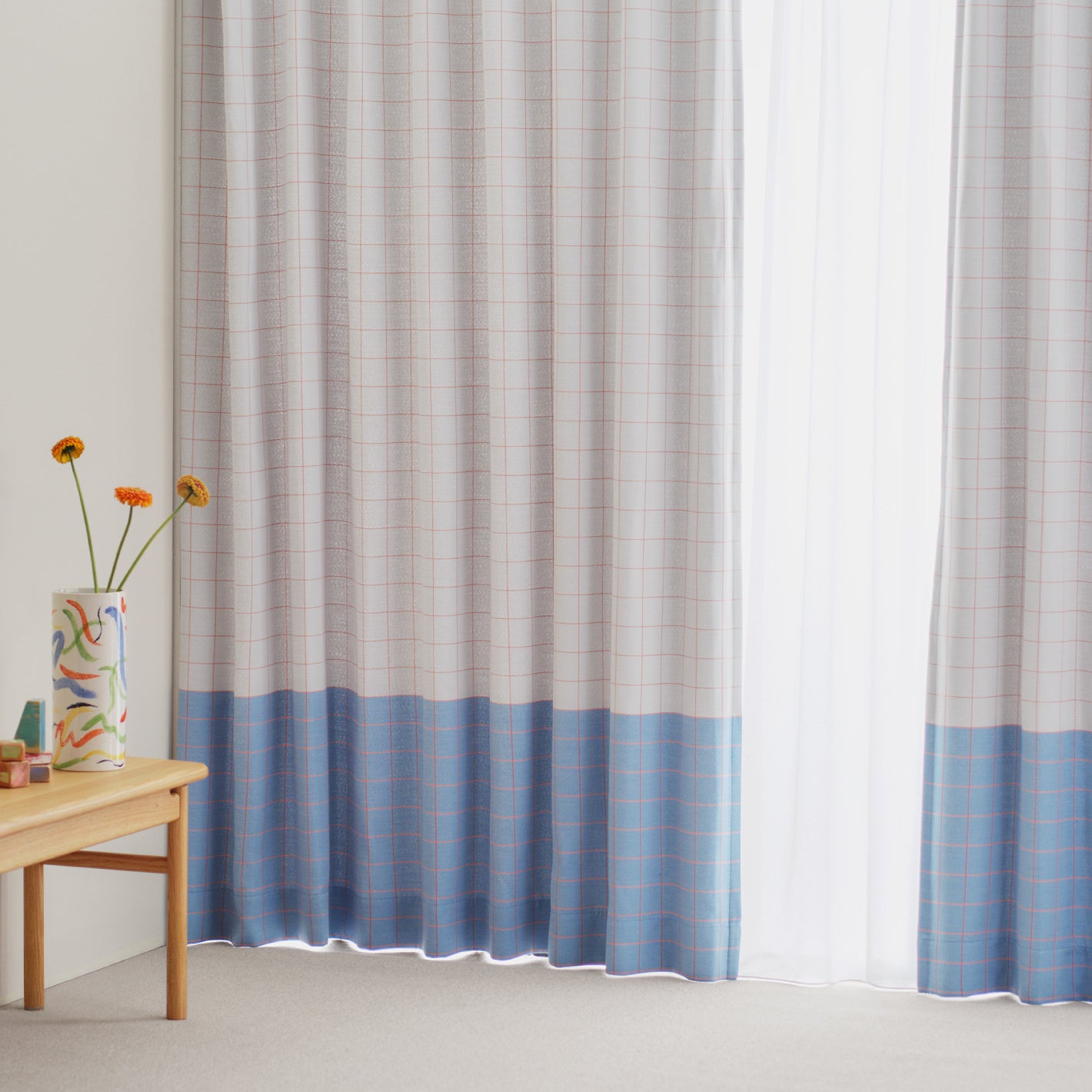 裾で大胆に色を切り替えた、バイカラーの遮光カーテン。