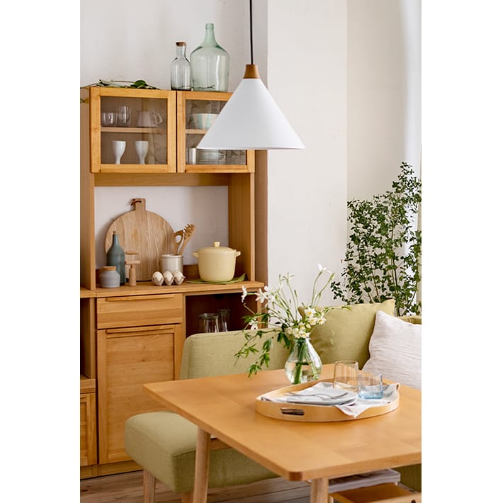 シンプルで飽きのこないデザインのシェードに、温かみのあるウォールナット無垢材を組み合わせたペンダントライト。