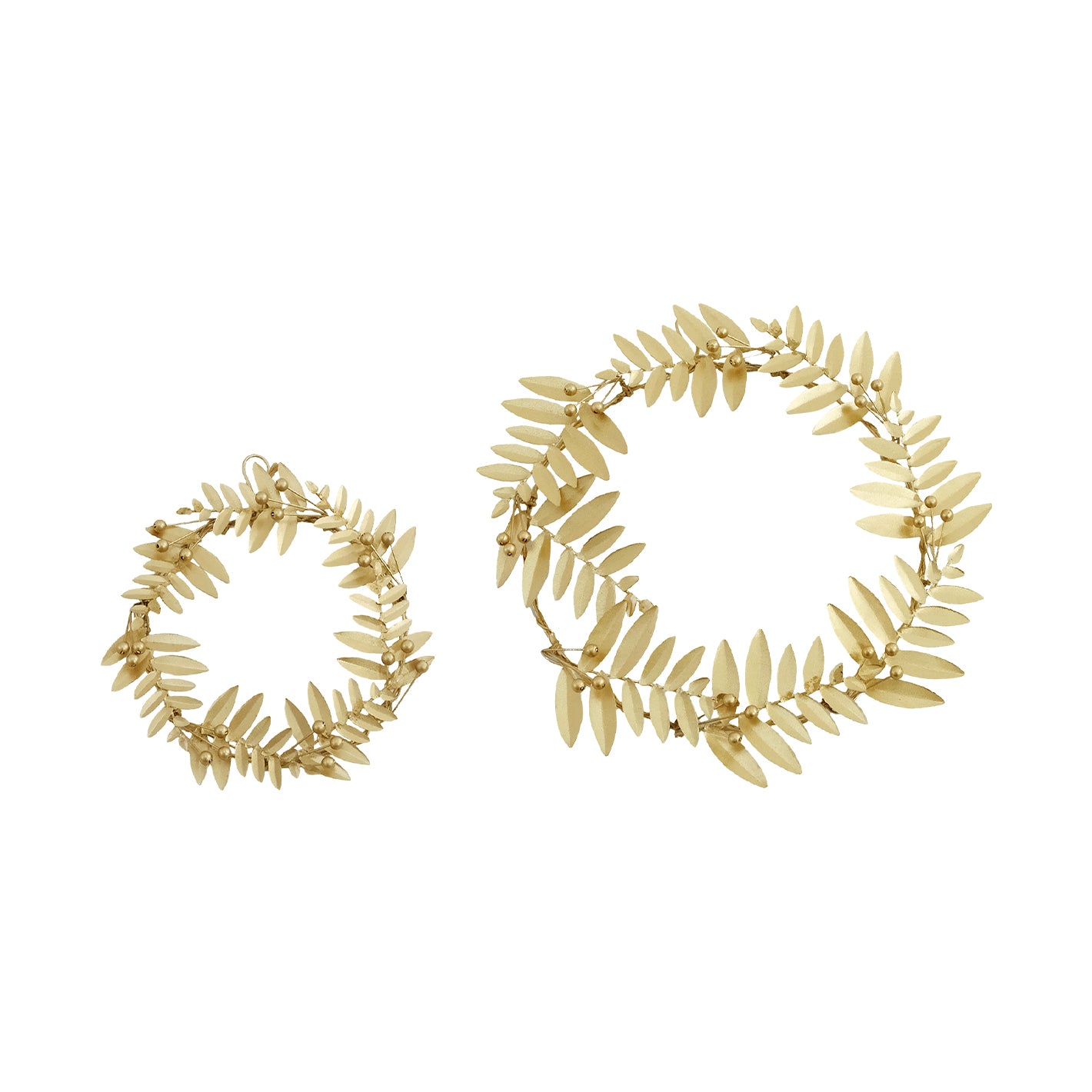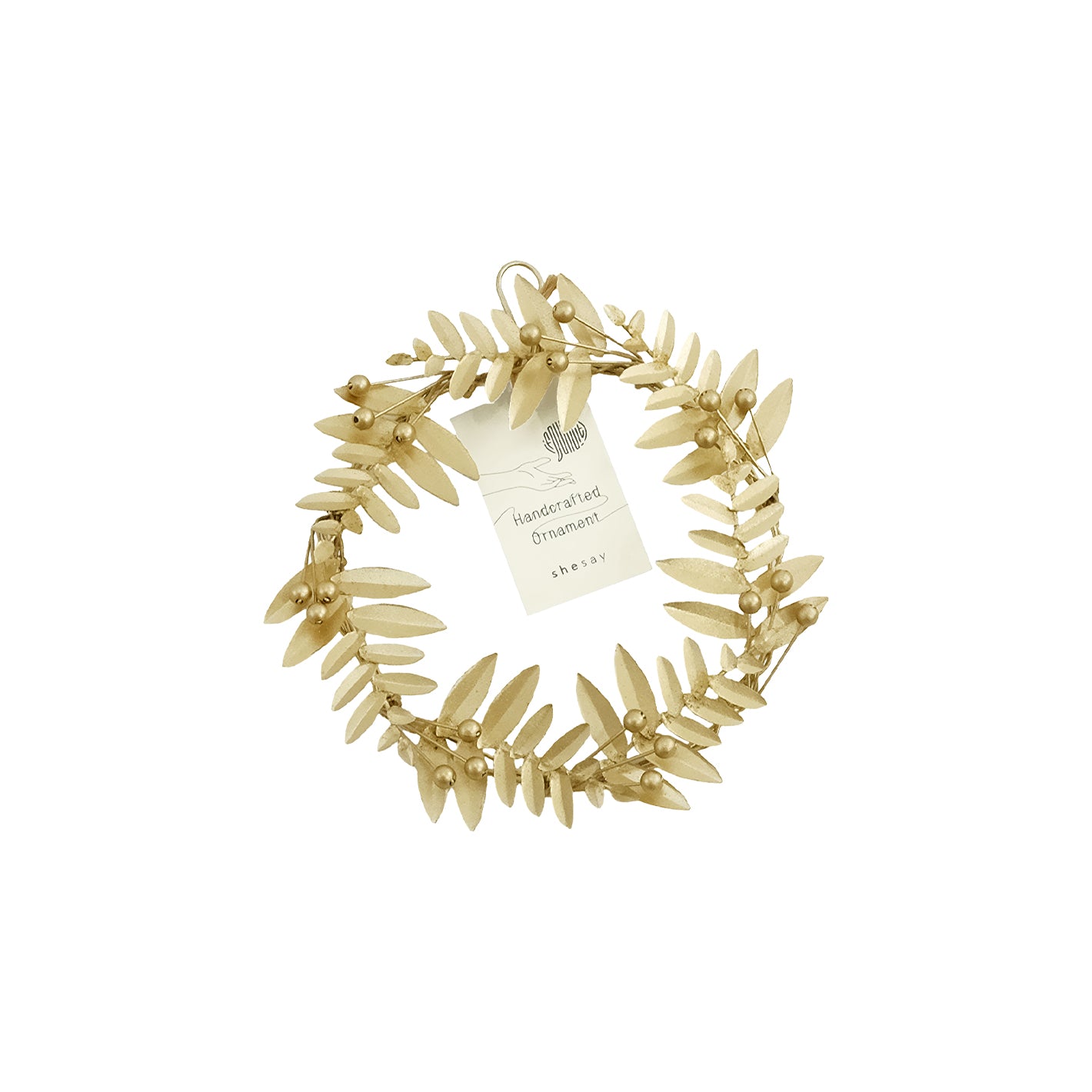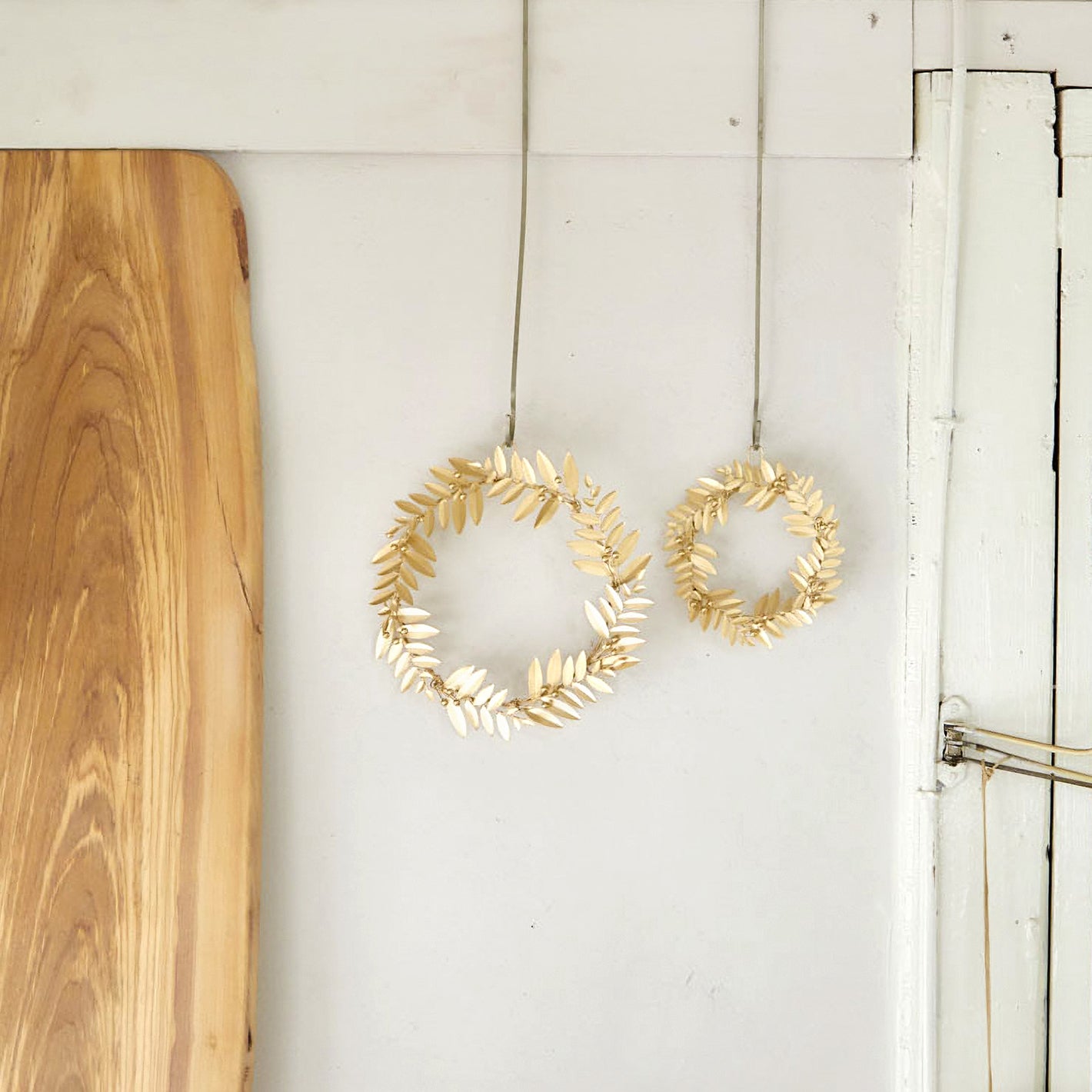 ブリキでできた葉を重ねた、クリスマスらしいワイヤーリース。